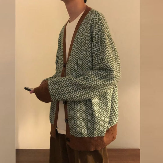 Vintage Patchwork Ribbed V Neck Sweater Cardigans Men Fashion Button-down Knit Jacket For Mens Autumn Loose Long Sleeve Sweaters