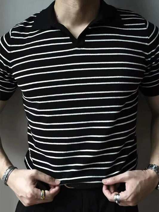 Vintage Striped Knit Polo Shirts Men Short Sleeve Casual Tops Spring Summer Mens Fashion Buttoned Turn-down Collar Slim T Shirt