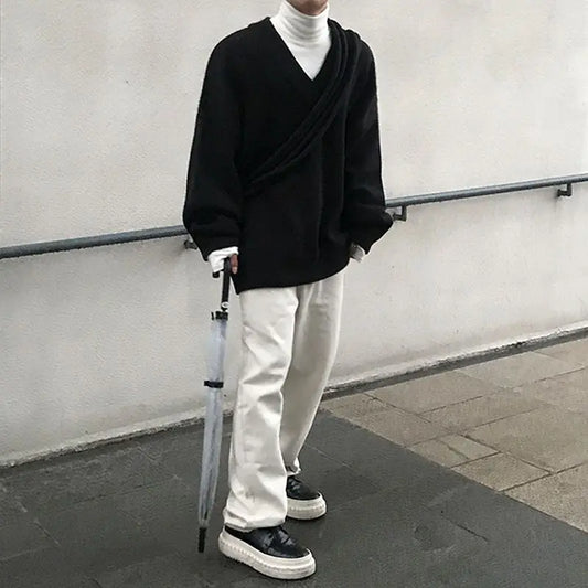 Winter Men's Sweater Vintage V-neck Sweater Pullover Korean Fashion Thicken Loose Casual Solid Color Knitted Sweater for Men