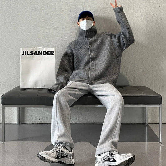 Winter Clothing Men's Luxury Knitted Jacquard Turtleneck Cardigan Sweatercoat Long Sleeve Casual Buttons Solid Color Coat