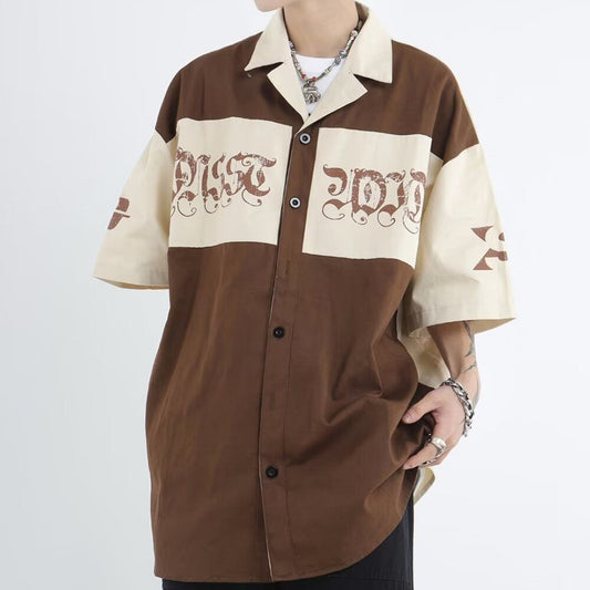 Summer New Hiphop Shirt Y2K Lapel Fashion Color Contrast Splicing Tooling Loose Short-sleeved Shirt Top Men's Clothing