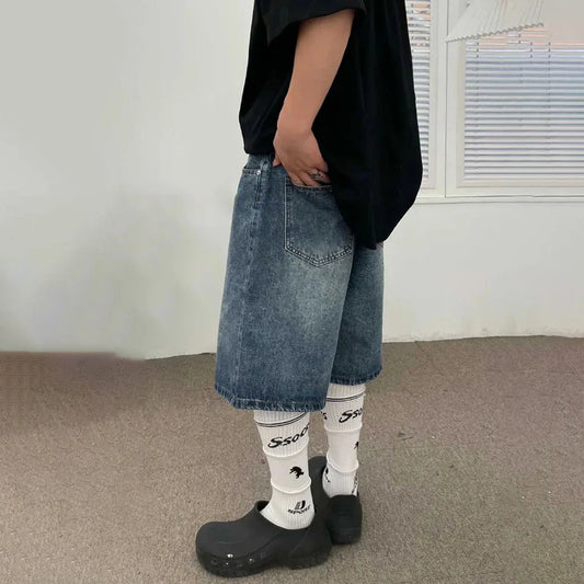 Summer Simple Large Size Loose Washed Jeans Men's Y2k High Street Sports Retro Casual Five-point Pants Design Trendy Shorts