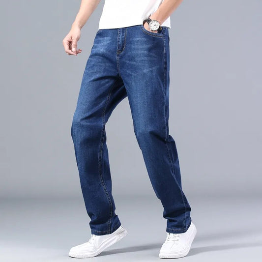 New Classic Men's Thin Blue Jeans Advanced Stretch Loose Straight Denim Trousers Male Brand Pants Plus Size 40 42 44