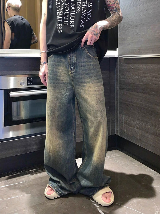 Niche worn and distressed retro washed straight jeans men's autumn new loose versatile wide-leg mopping trousers