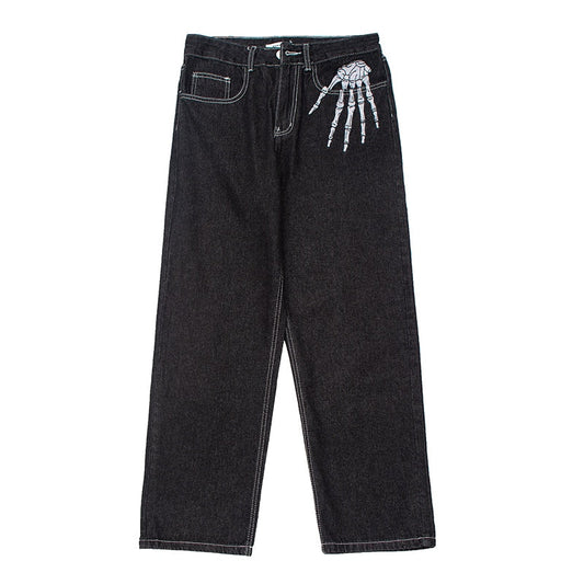 Retro Skull Hand Bone Embroidery Washed Mens Jeans Pants Vibe Style Straight Casual Oversize Denin Trousers Streetwear