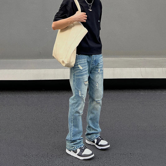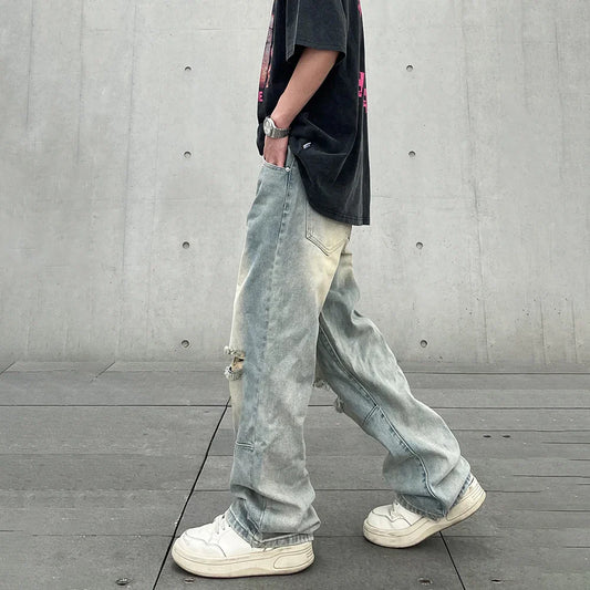 Retro Hole Ripped Distressed Jeans for Men Straight Washed Harajuku Hip Hop Loose Denim Trousers Vibe Style Casual Jean Pants