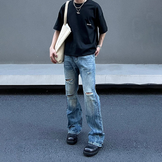 Ripped Jeans Men Designer Streetwear Loose Y2k Flared Trousers Summer Vintage Street Casual Fashion Autumn Wide Leg Denim Pants