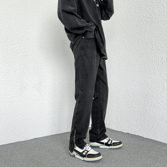 saferido 2024 Spring New Style Korean Style Men Fashionable Retro Street Jeans Zip Design on Trouser Legs Straight-leg Denim Pants Black
