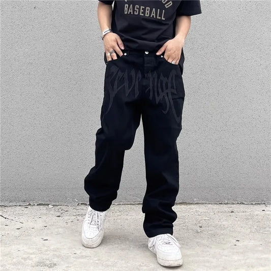 saferido Dark Black American Embroidery Fashion Brand Pants High Street Design Sense Embroidery Letter Loose Straight Leg Jeans for Men