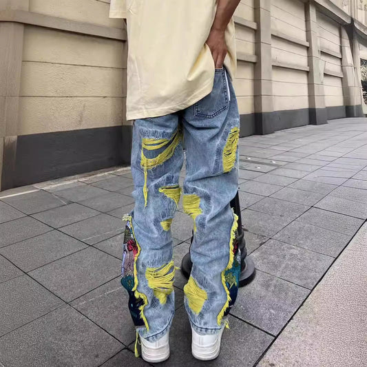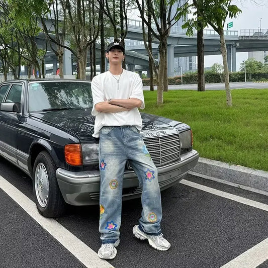 saferido drip outfit men High Street American Contrast Color Patch Bird Plum Embroidery Worn Niche Jeans Men's and Women's Same Loose Trousers