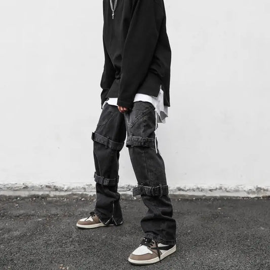 saferido fall mens outfits High Street Vibe Style Vintage Lightning Pattern Machete Jeans Men's American Casual Straight Wide Leg Slimming Skinny Pants