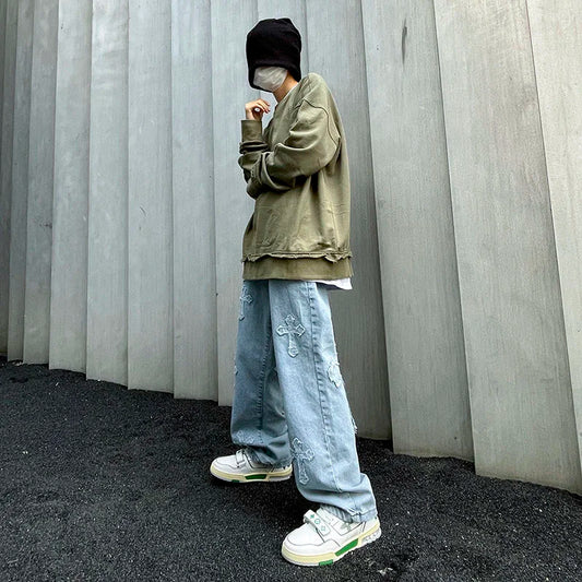 saferido Men's Autumn American Loose High-Waisted Straight-Leg Coconut Tree Embroidered Jeans Retro Simple Casual Comfort Wide-Leg Pants