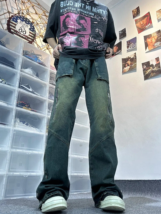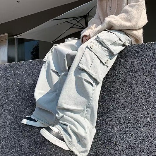 saferido mens fashion Retro American-Style Large Pocket Jeans Men's High Street Vibe Wide-Leg Pants Niche Workwear Ruan Handsome Trousers