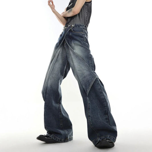 saferido Mens Autumn Winter American Street Niche Y2k Heavy-Duty Distressed Washed Jeans Irregular Variable Bell Pants Wide-Leg Pants