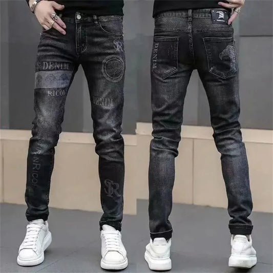 saferido Mens Denim Print Pants Jeans Korea Slimming Trendy Casual Jeans All-match Streetwear Light Luxury Men Jeans Pants for Men