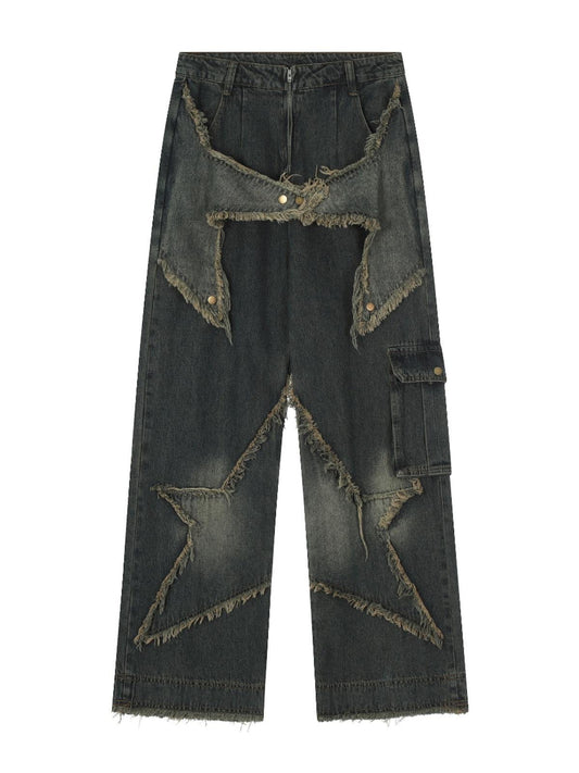 saferido skater boy outfits American-Style Retro Multi-Pocket Star Frayed Jeans Men's and Women's Loose Washed Distressed Wide-Leg Pants Summer
