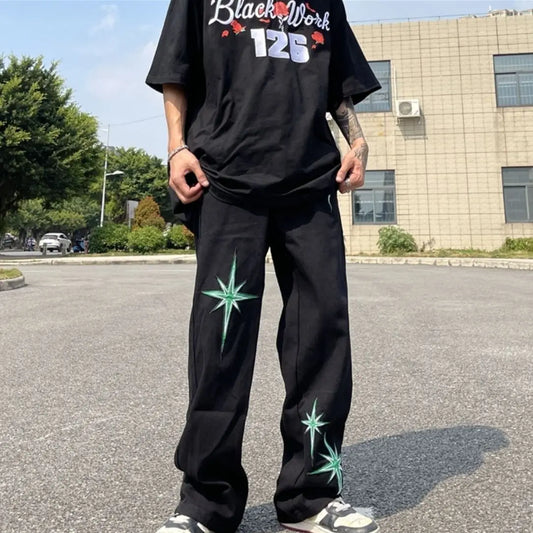 saferido Summer American Street Hip Hop Y2K Embroidered Loose Fit Straight Leg Jeans Men's High Street Fashion Versatile Pants