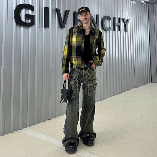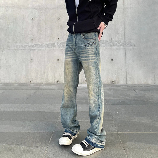 Streetwear Heavy Craft Washed Distressed Faded Jeans Flare Slim Straight Tassel Jeans for Men and Women Raw Edge Denim Pants