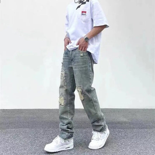 Street Wash Worn Cut Jeans Men's Summer Fashion Loose Straight Pants Traf Fall Guys