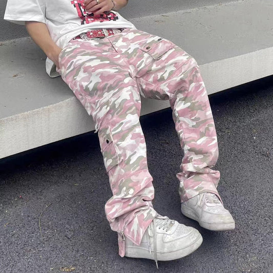 Streetwear Camouflage Patchwork Casual Straight Jeans Cargos for Men Y2K Harajuku Pockets Ankle Zipper Baggy Denim Trousers