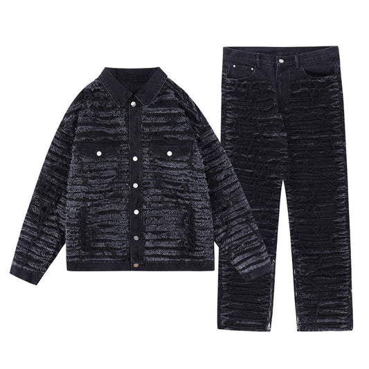 Fashion Men's Distressed Denim Suits Streetwear Harajuku Solid Color Loose Spliced Cowboy Jackets and Jeans 2 Piece Sets Unisex