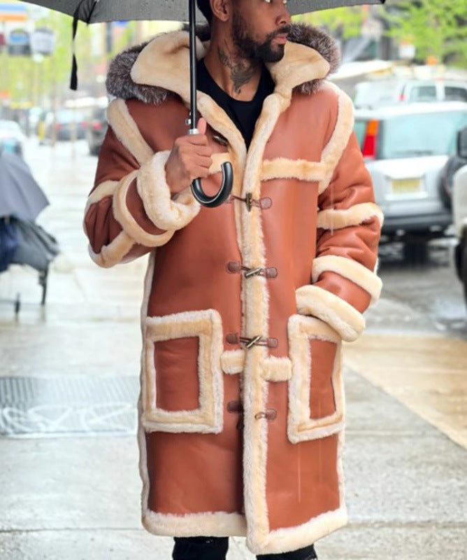 2025 New wish New brown big fur collar hooded horn buckle men's long leather jacket 6574