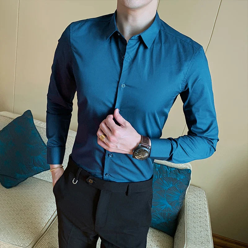 7 Colors Men's Business Fashion Solid Color Long Sleeve Shirt Classic Style Cotton Casual White Slim Fit Shirt Office Clothes