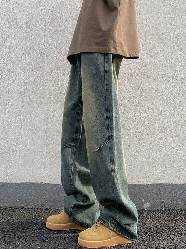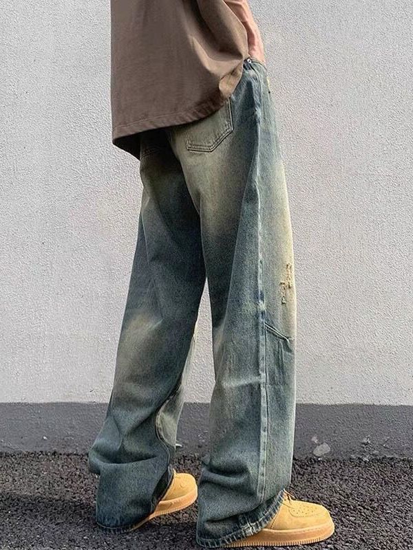 Washed distressed jeans for men American retro spring and autumn loose wide-leg straight-leg floor-length trousers street-style cool pants