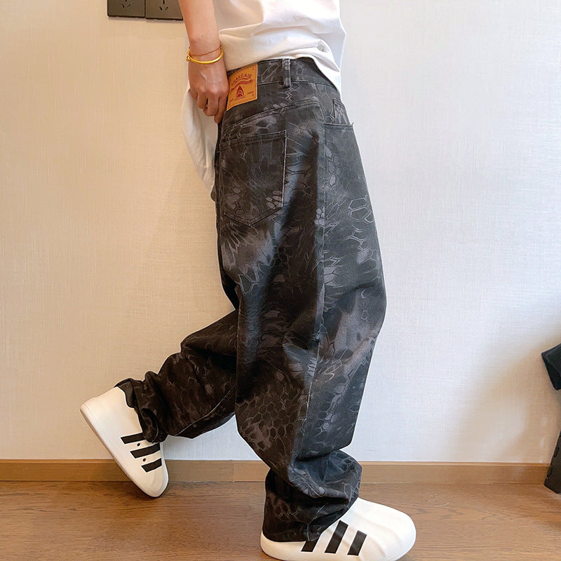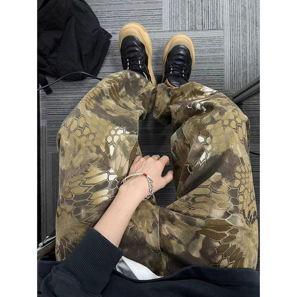 Spring and Autumn New Retro Canvas Snake Pattern Camouflage Heavy Washed Handsome Loose Casual Pants Scimitar Pants Men