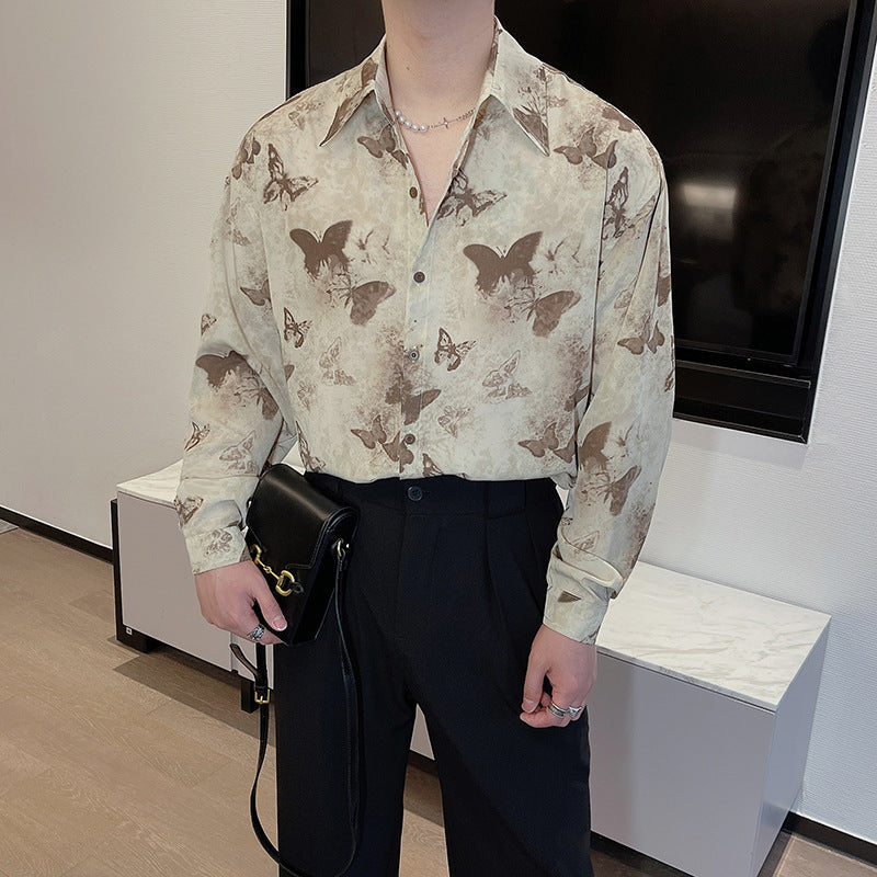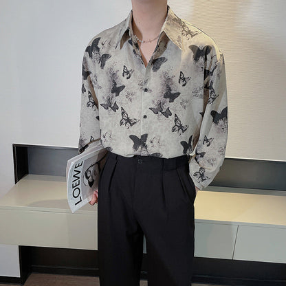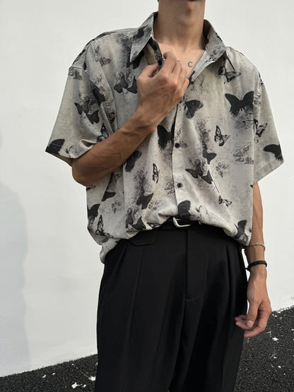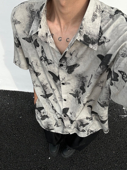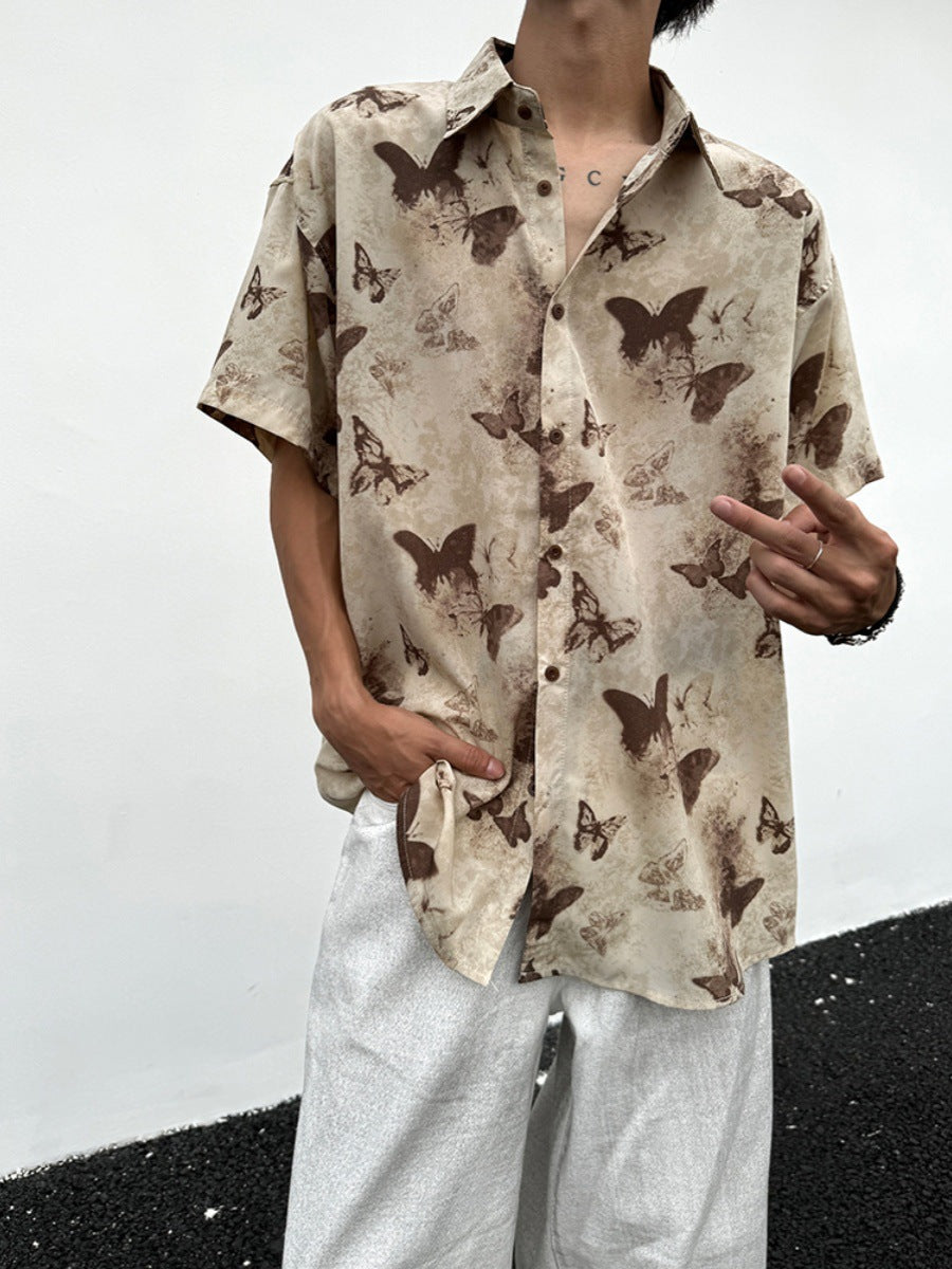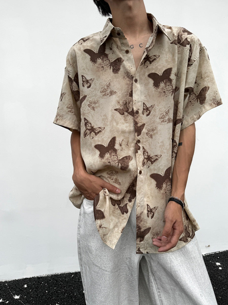 National style niche design butterfly short-sleeved shirt men's summer new loose drape cleanfit full print shirt