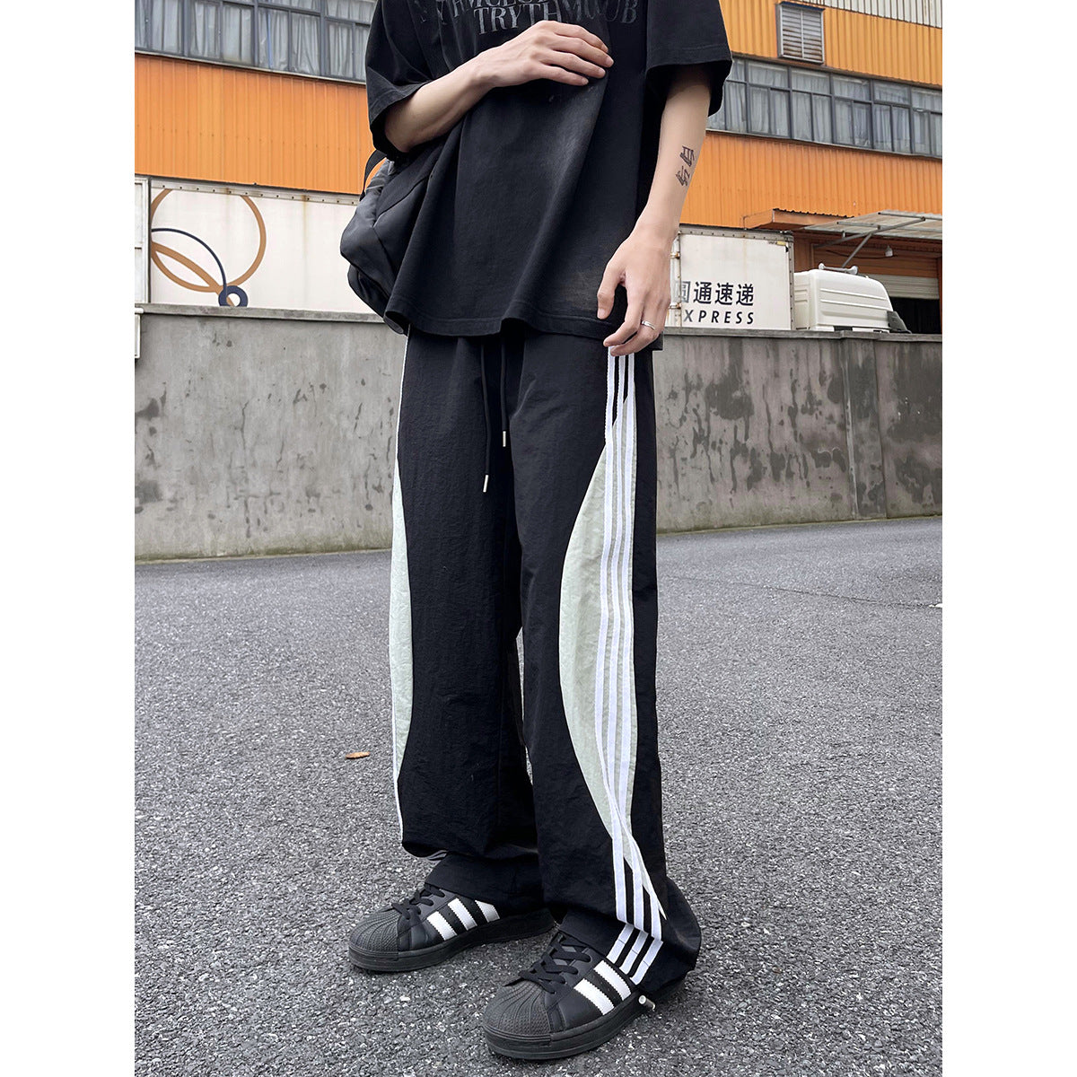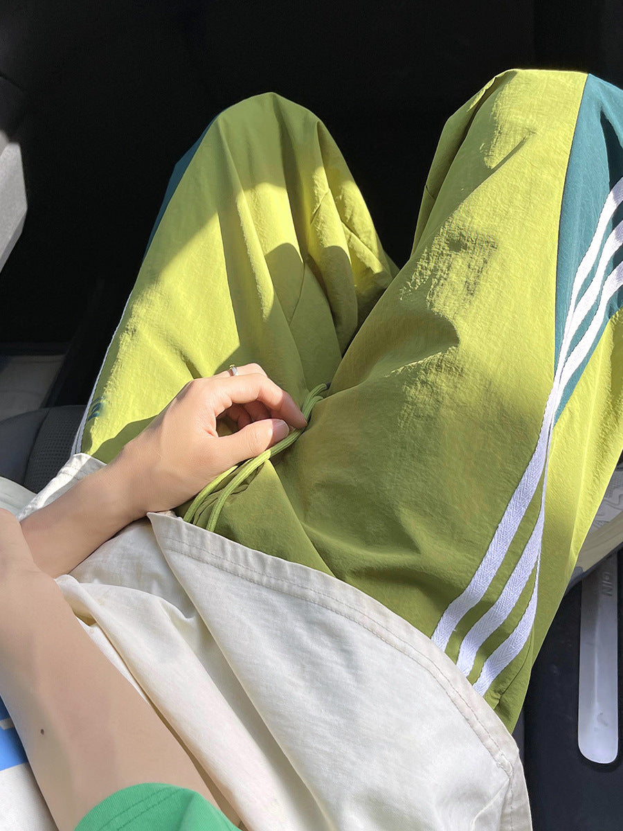 Summer dopamine quick-drying casual pants men's trendy three-bar contrast color loose straight American sports paratrooper pants
