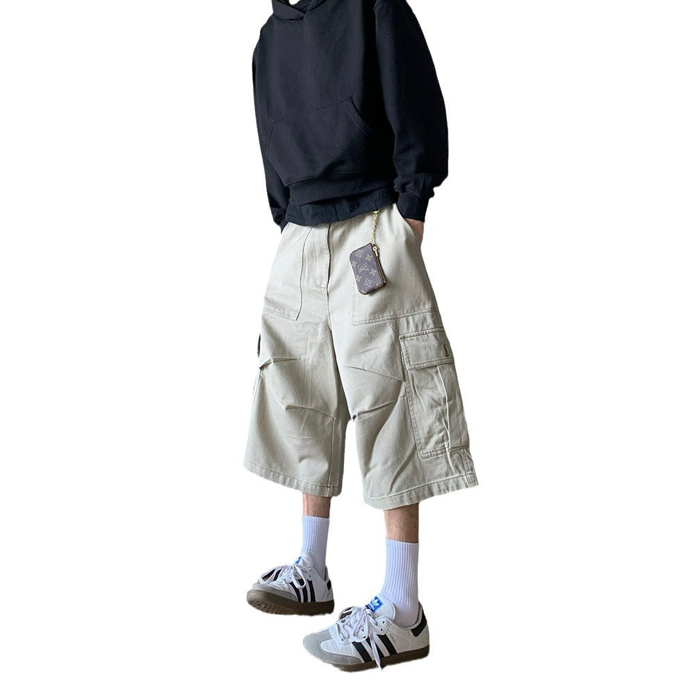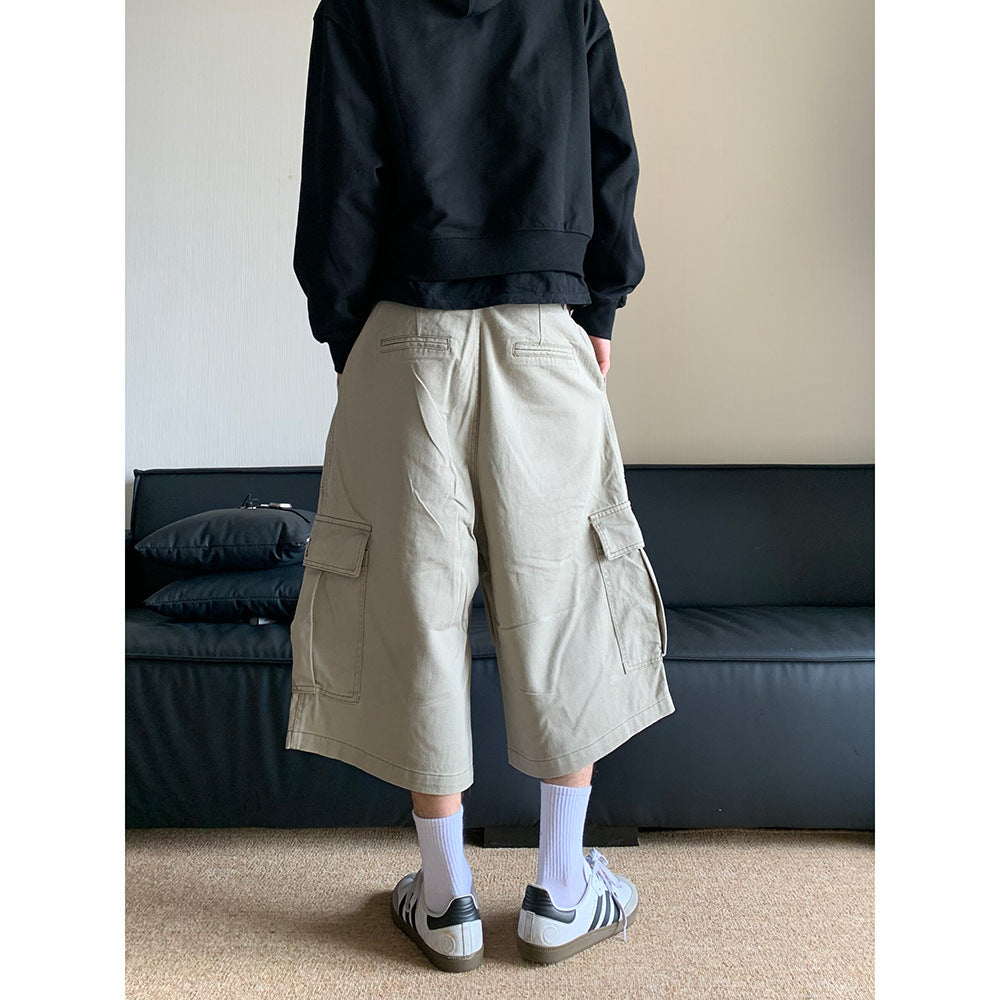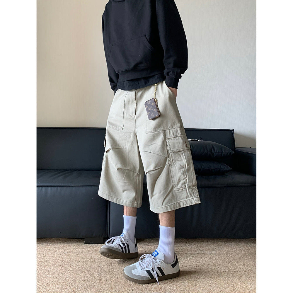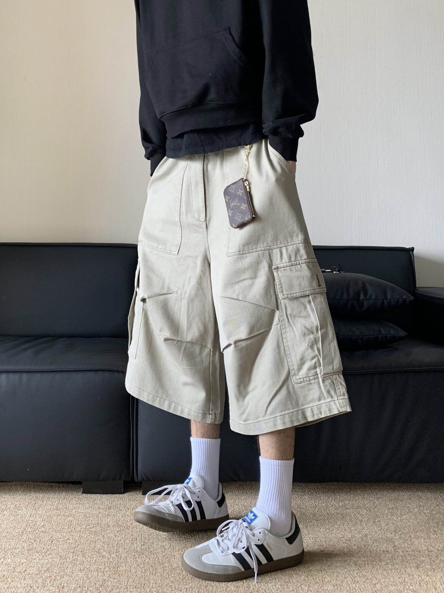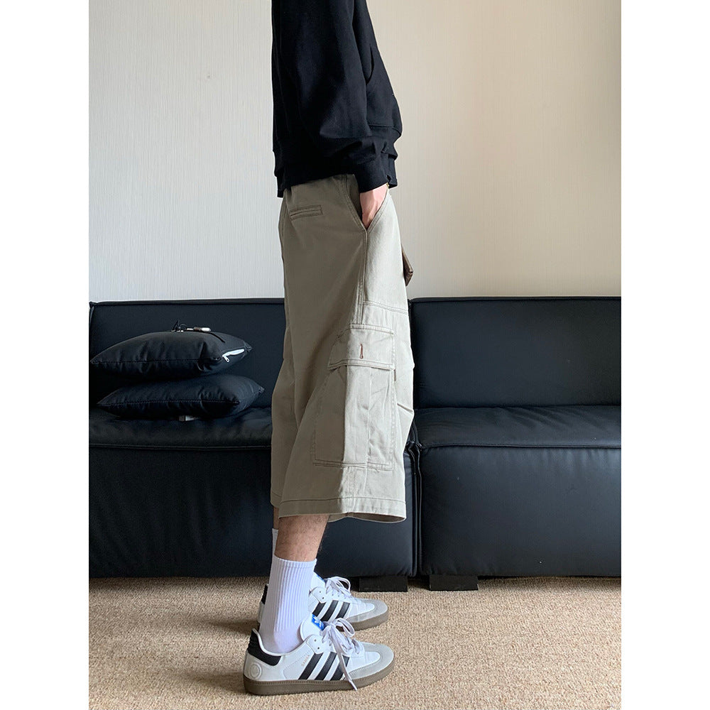 American retro big pocket wide leg workwear cropped jeans men's summer new loose versatile casual shorts