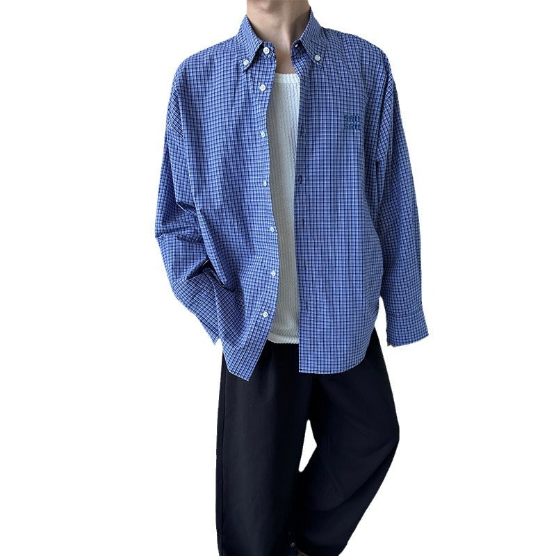 American retro lazy loose blue plaid long-sleeved shirt men new versatile casual embroidered shirt trend