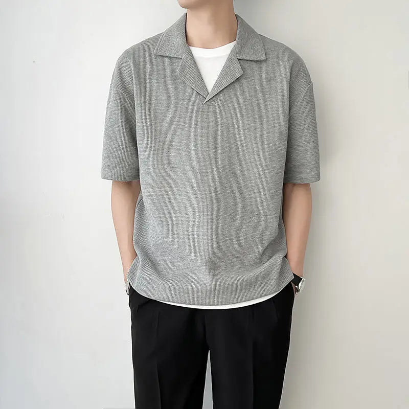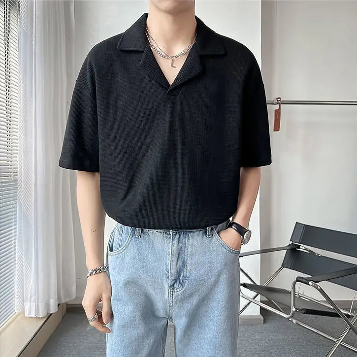 American Solid Color Cuban Collar T-shirt Short Sleeve Mens Niche Design New Summer Lapel Loose Waffle T Shirts for Men