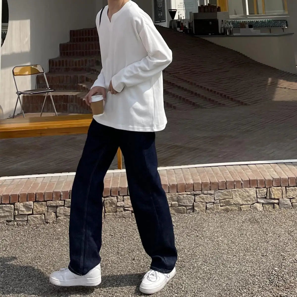 Autumn 100% Cotton V-neck Long Sleeve T-shirts Men Ins Korean Casual Solid Color Tops High-end Design Loose Bottoming Shirt Men