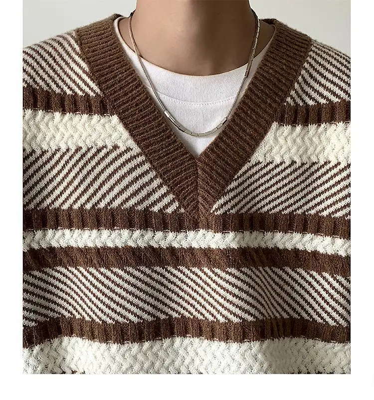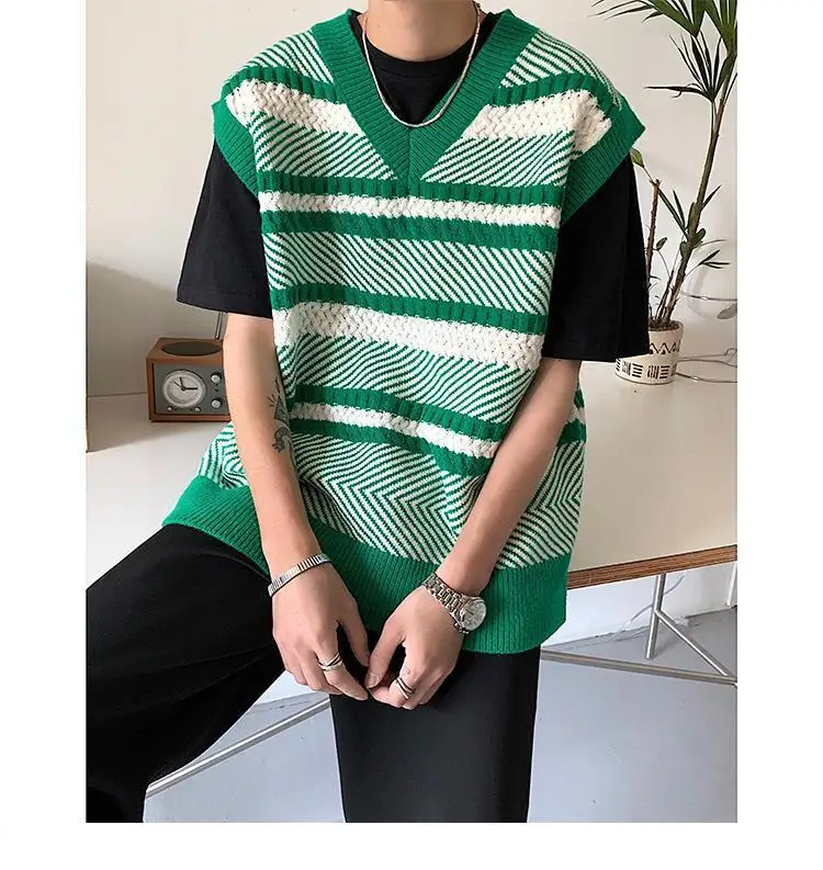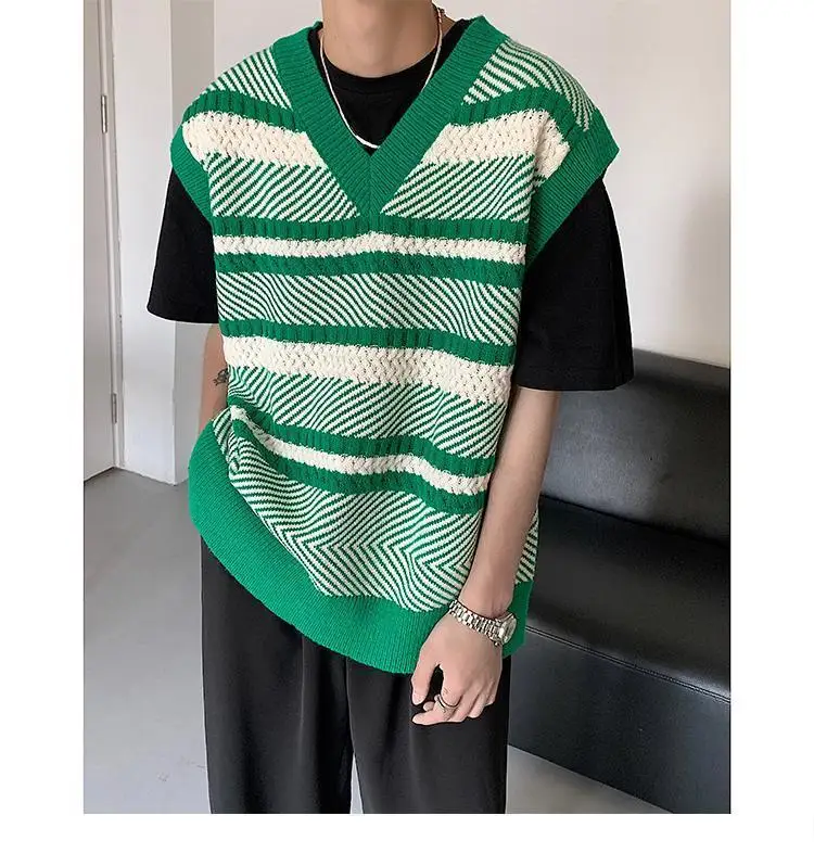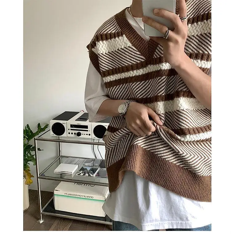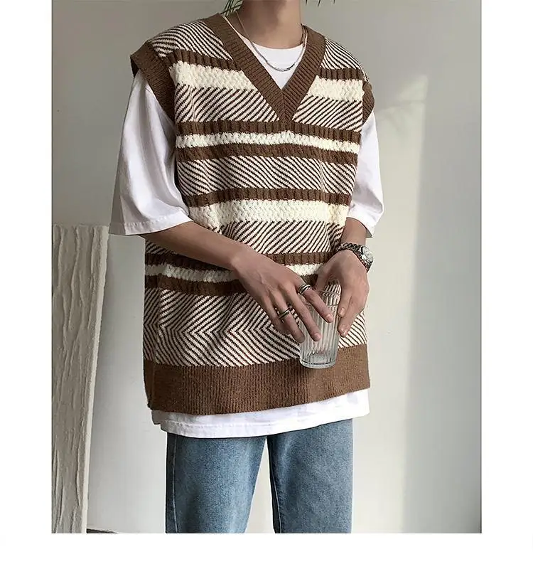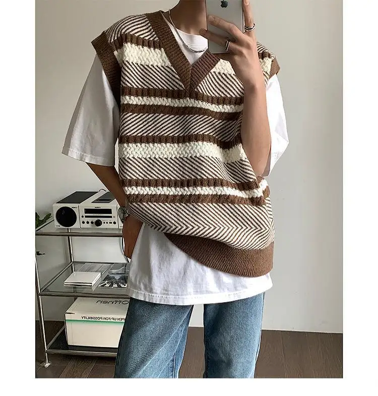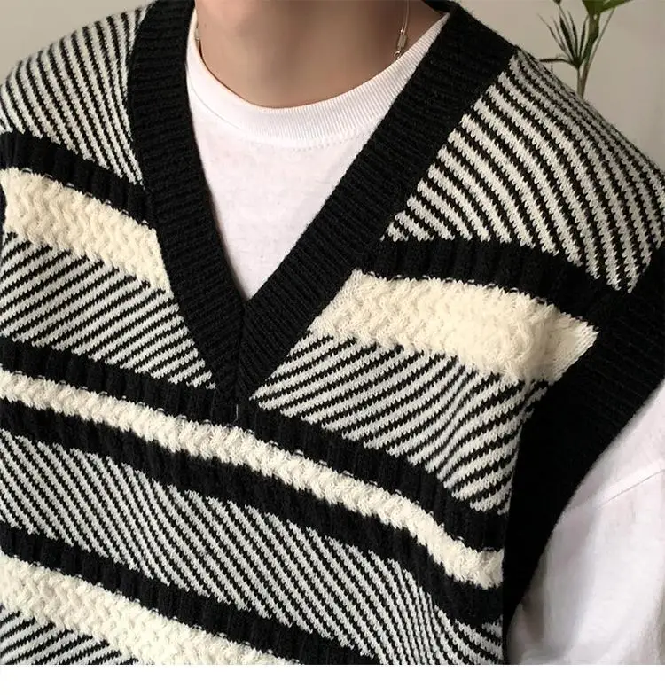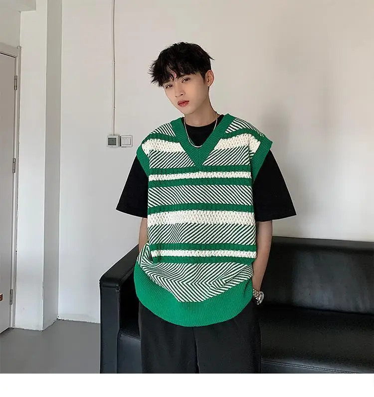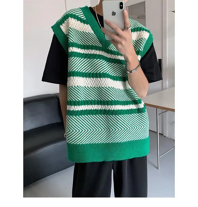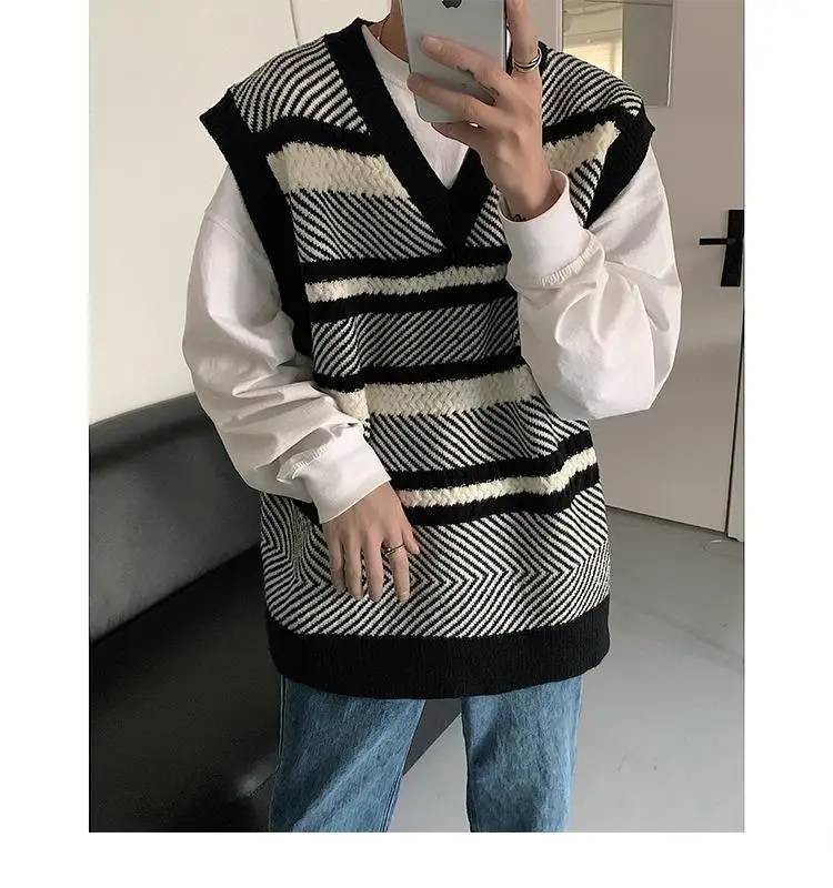 Autumn New Color Block Striped Sweater Vest for Men Korean Fashion Casual Loose Sleeveless Knitted Sweater Vests Men and Women