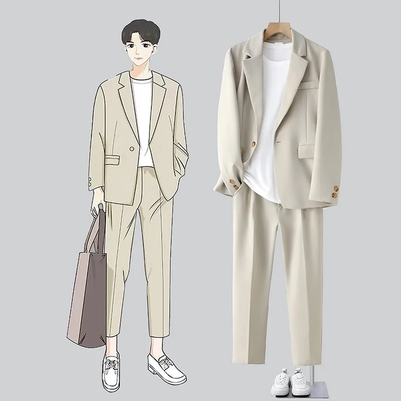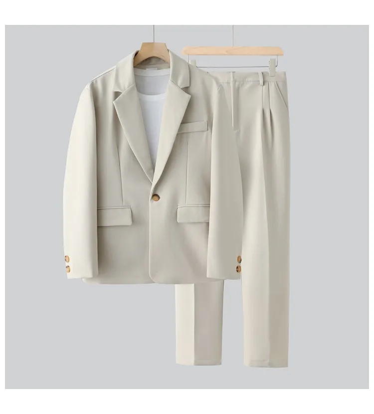 Beige Suit Men Fashion Society Men Dress Suit Korean Loose Casual Blazer/Pants Two Piece Set Mens Office Formal Suit M-3XL