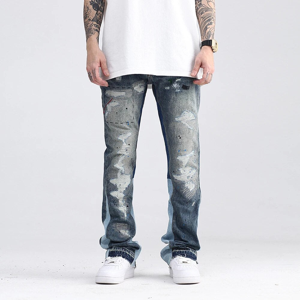 Blue Speckle ink Washed Destroyed Flared Jean Pants Hip Hop Graffiti Ripped Denim Jeans for Men Streetwear Vintage Wide Jeans