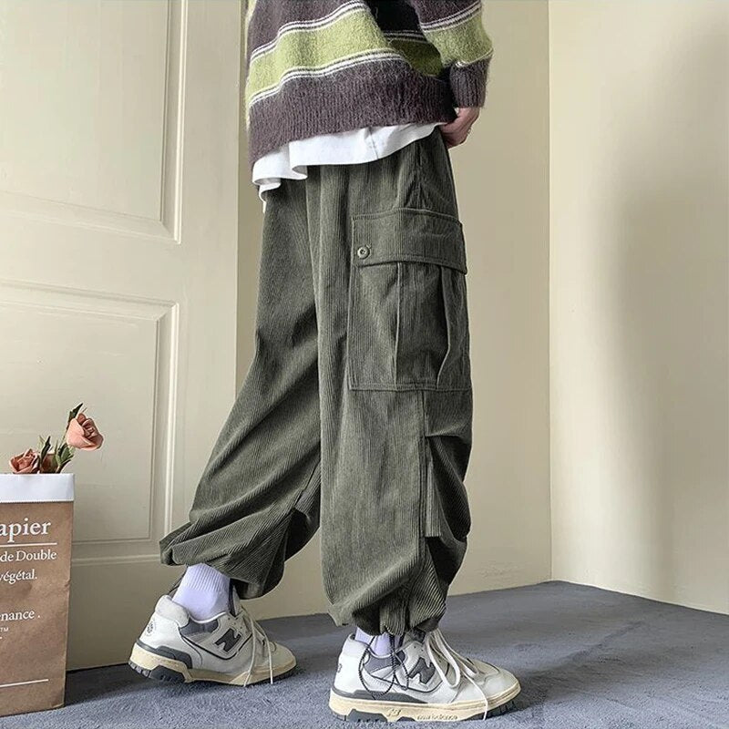 Corduroy Cargo Pants for Men Streetwear Black Cargo Trousers Male Joggers Hip Hop Green Black Japanese Pocket Korean