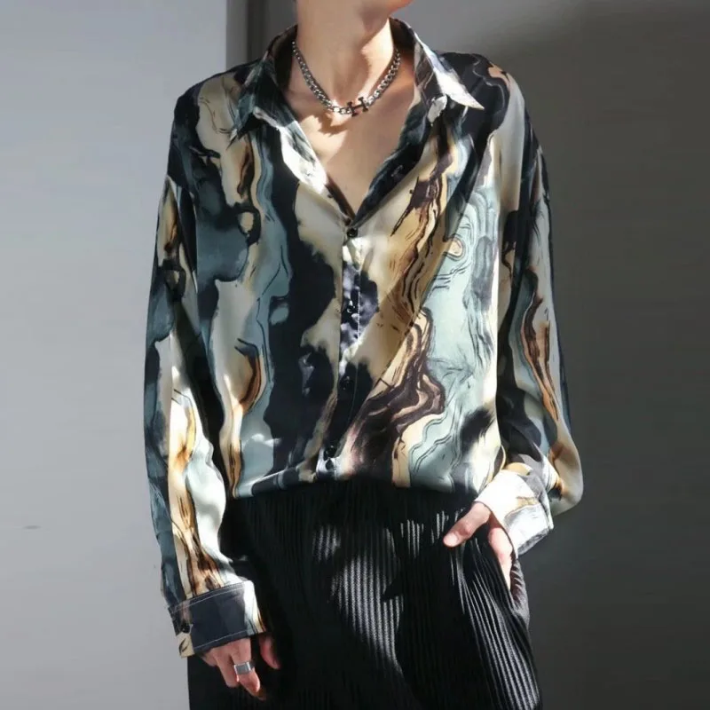 Fall Harajuku Shirts Men Y2K Style Graphic Print Long Sleeve Shirt Streetwear Mens Clothing Fashion Lapel Button-up Shirts