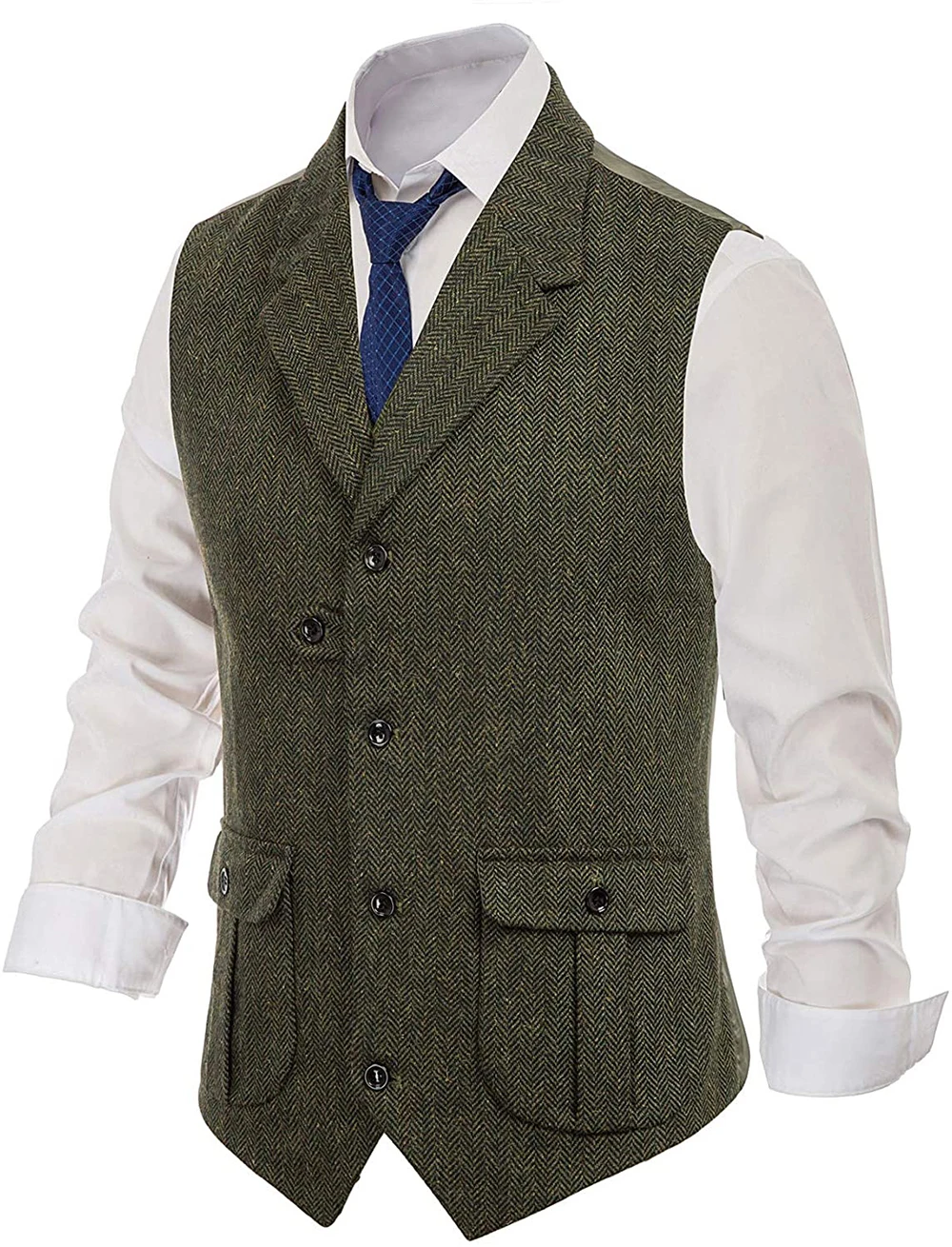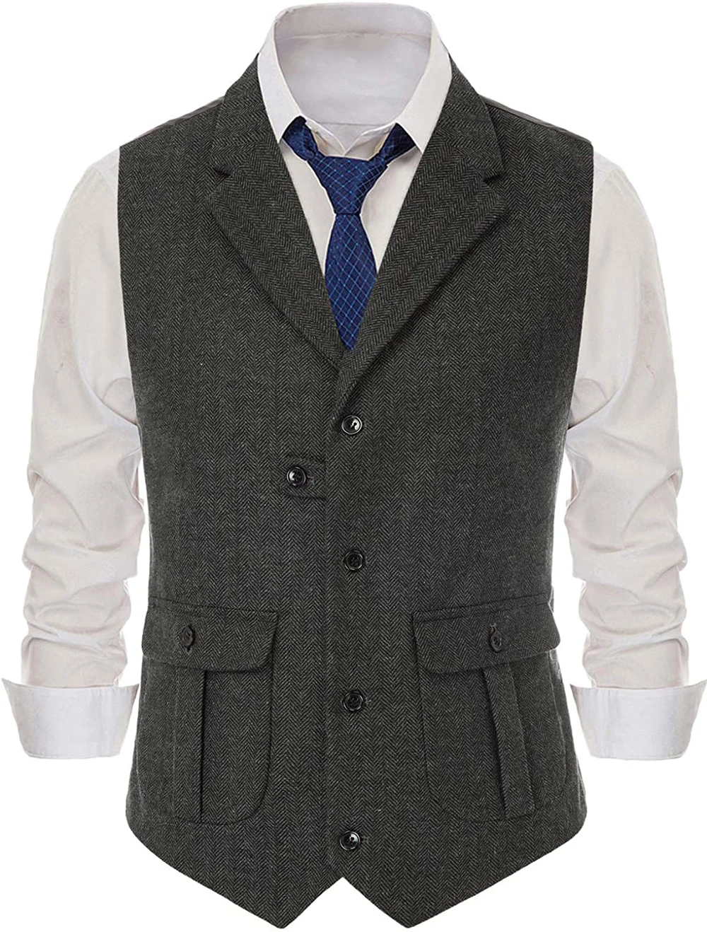 Herringbone Men's Vests Casual Suit Vest Notch Lapel with Two Pockets Herringbone Waistcoat for Wedding Groomsmen Men Vest