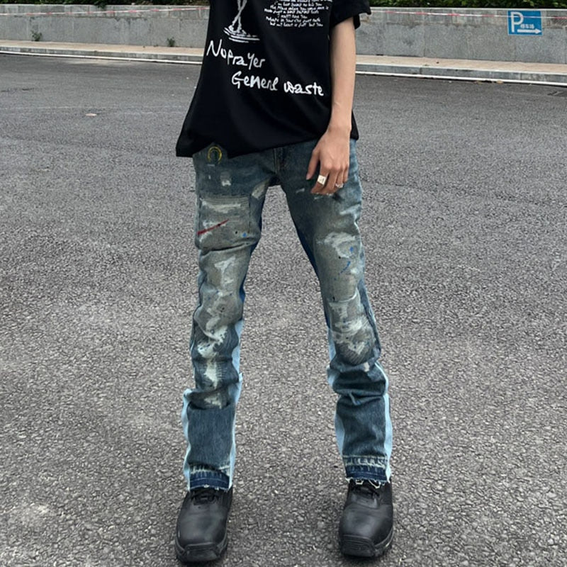 High Street Retro Ink Splash Patchwork Ripped Jeans Flare Pants Men and Women Straight Casual Oversized Loose Denim Trousers