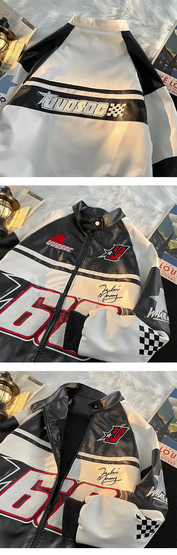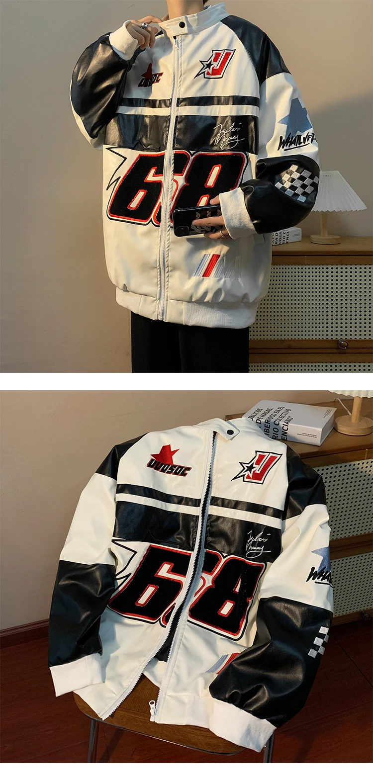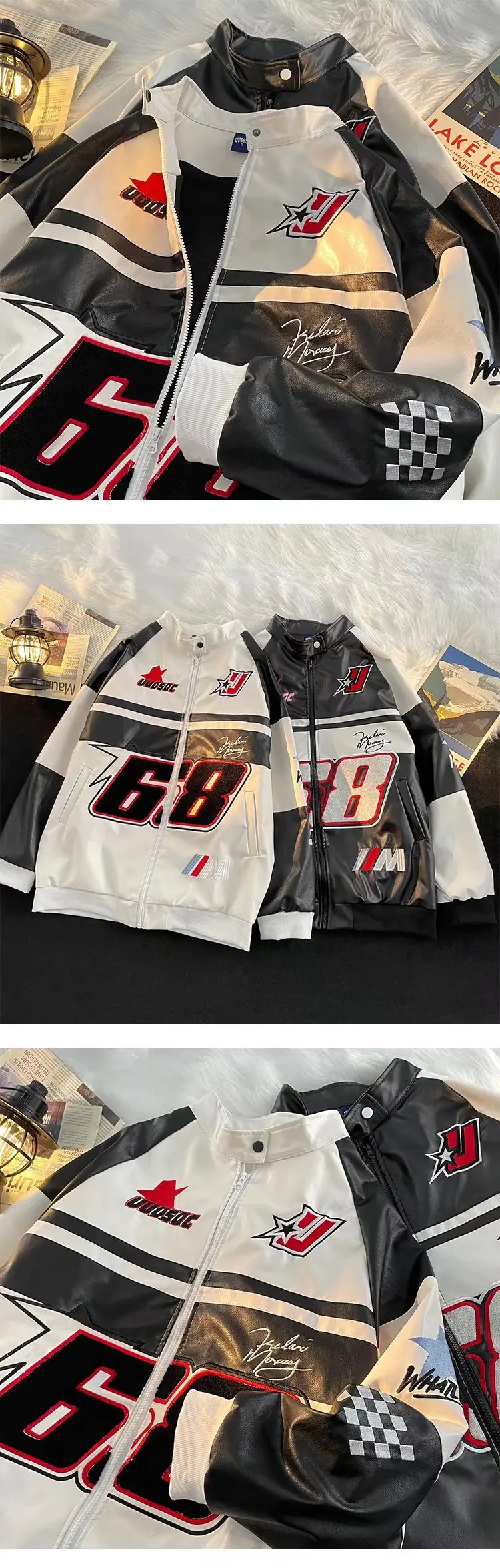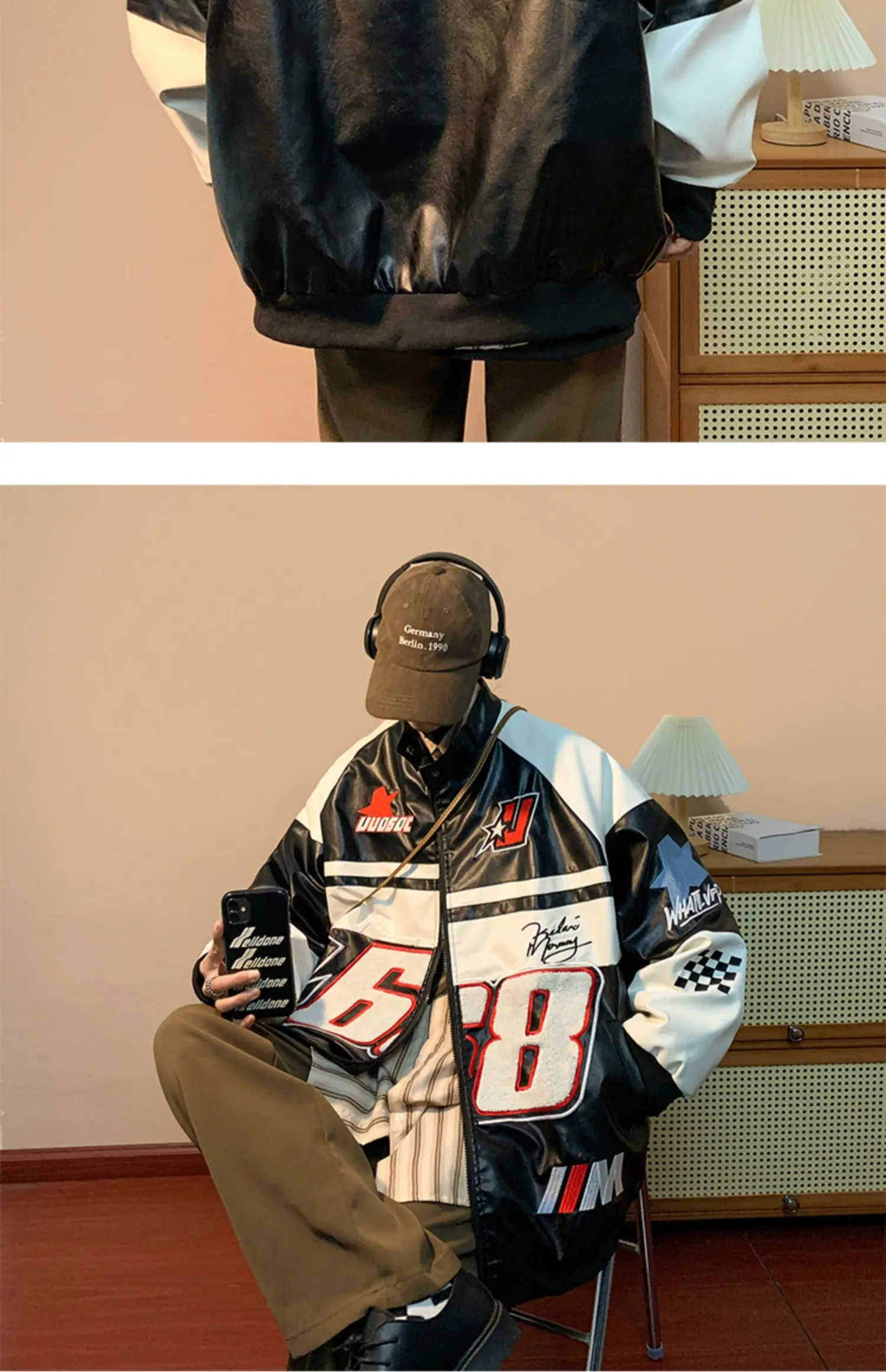 Hip Hop American PU Leather Jacket Men Patchwork Letter Embroidery Motorcycle Biker Coats Unisex Bomber Jacket Flocking Clothes