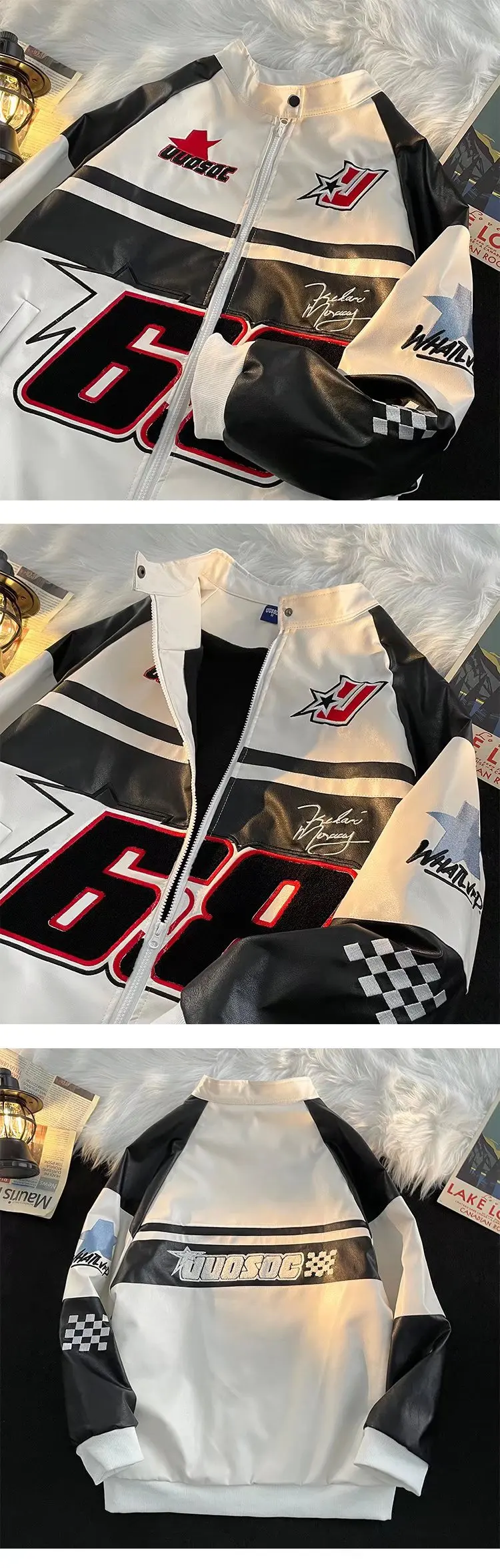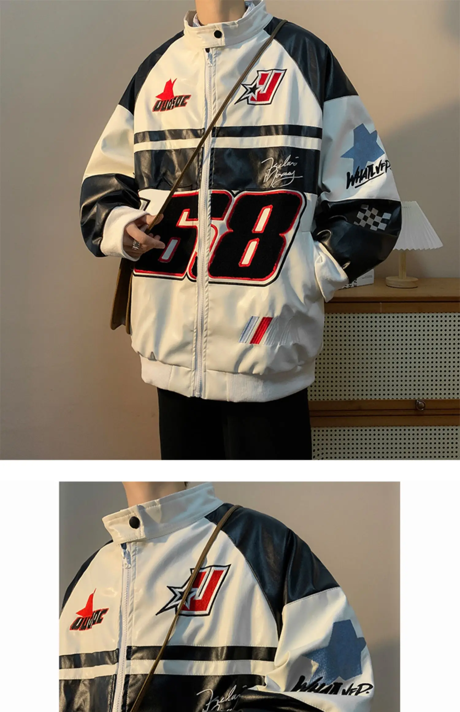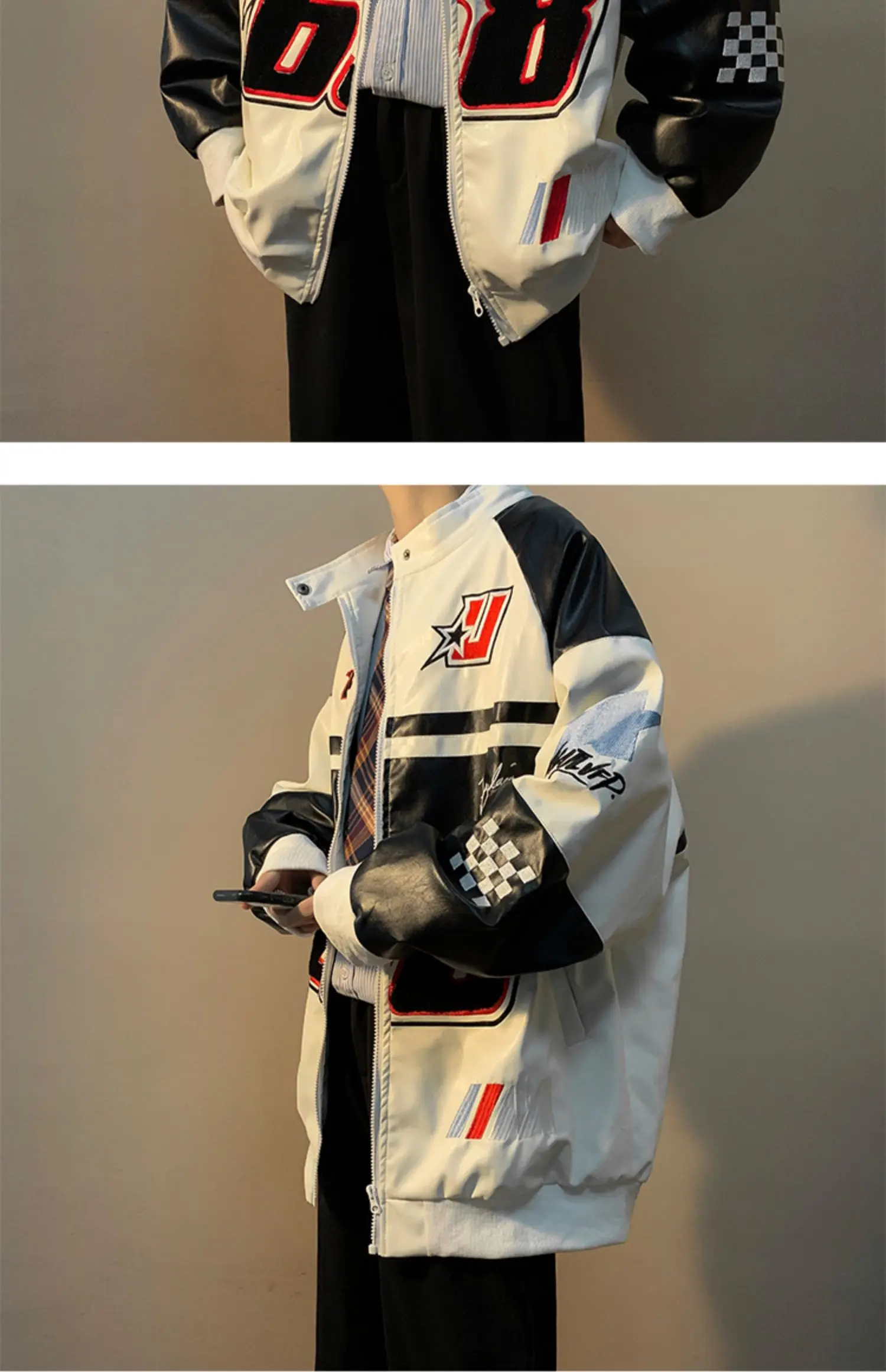 Hip Hop American PU Leather Jacket Men Patchwork Letter Embroidery Motorcycle Biker Coats Unisex Bomber Jacket Flocking Clothes