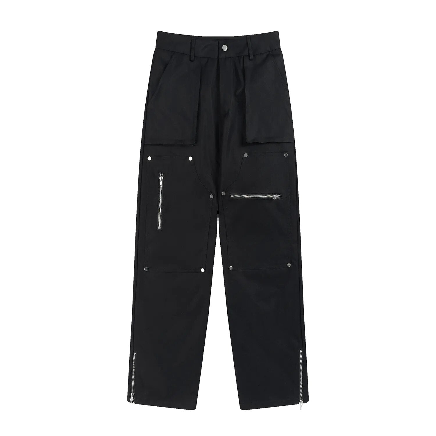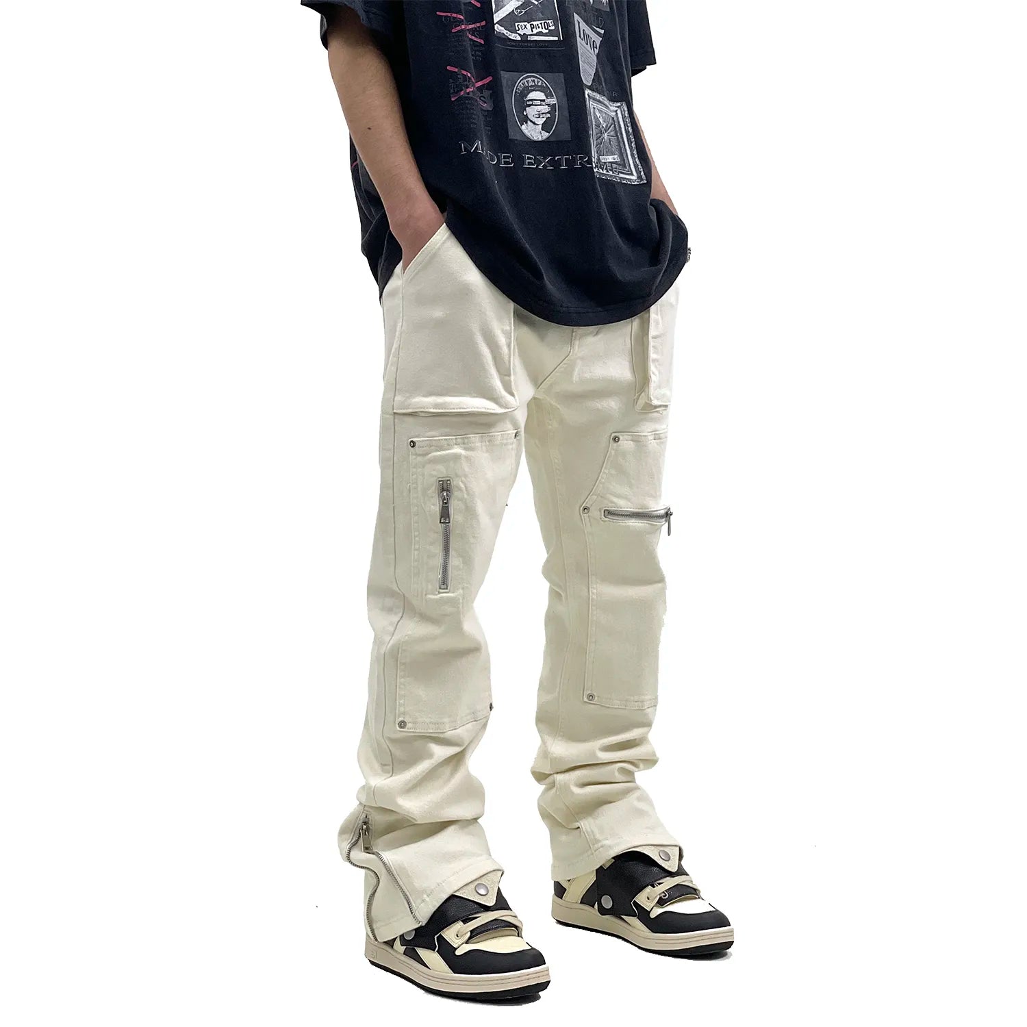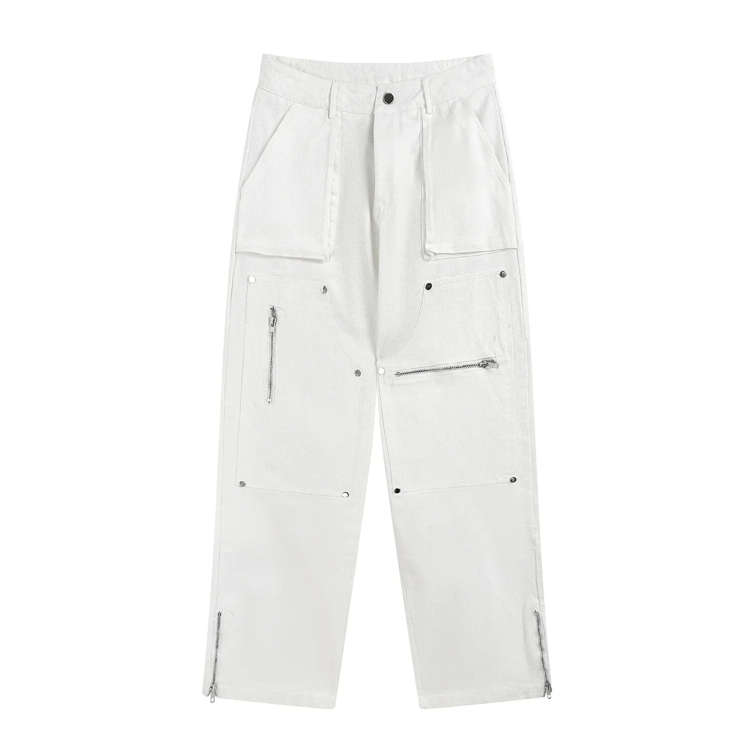 Hip Hop Vibe Heavy Functional Cargo Trousers for Men Fashionable Rivets Zipper Split Adjust Micro Flare Pants White Male Clothes
