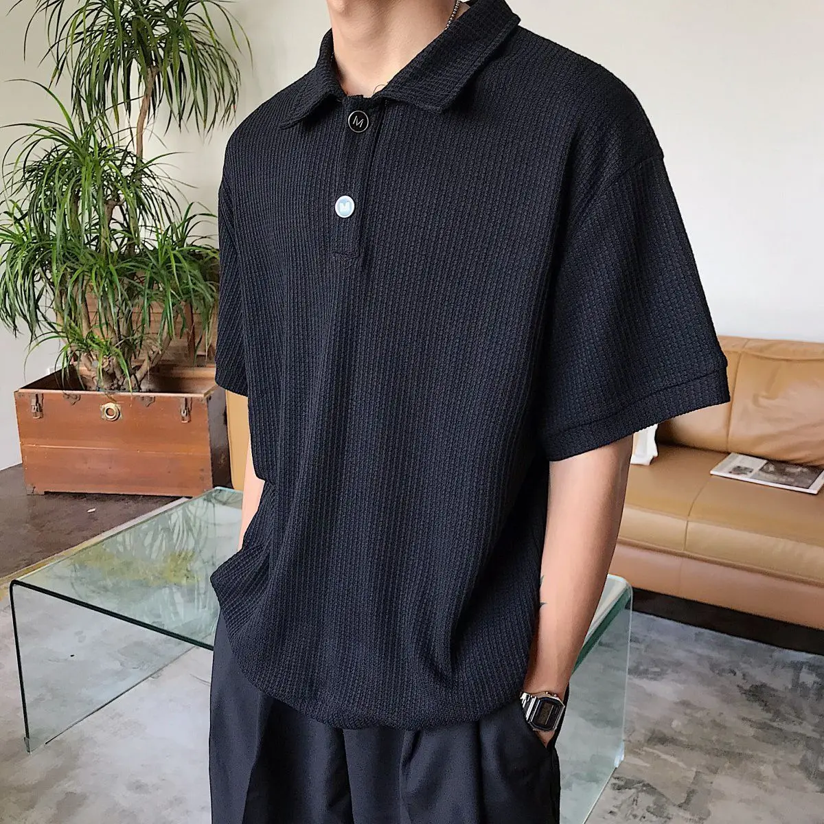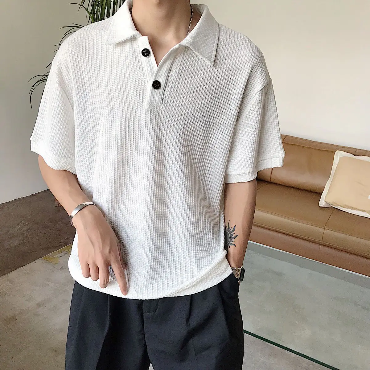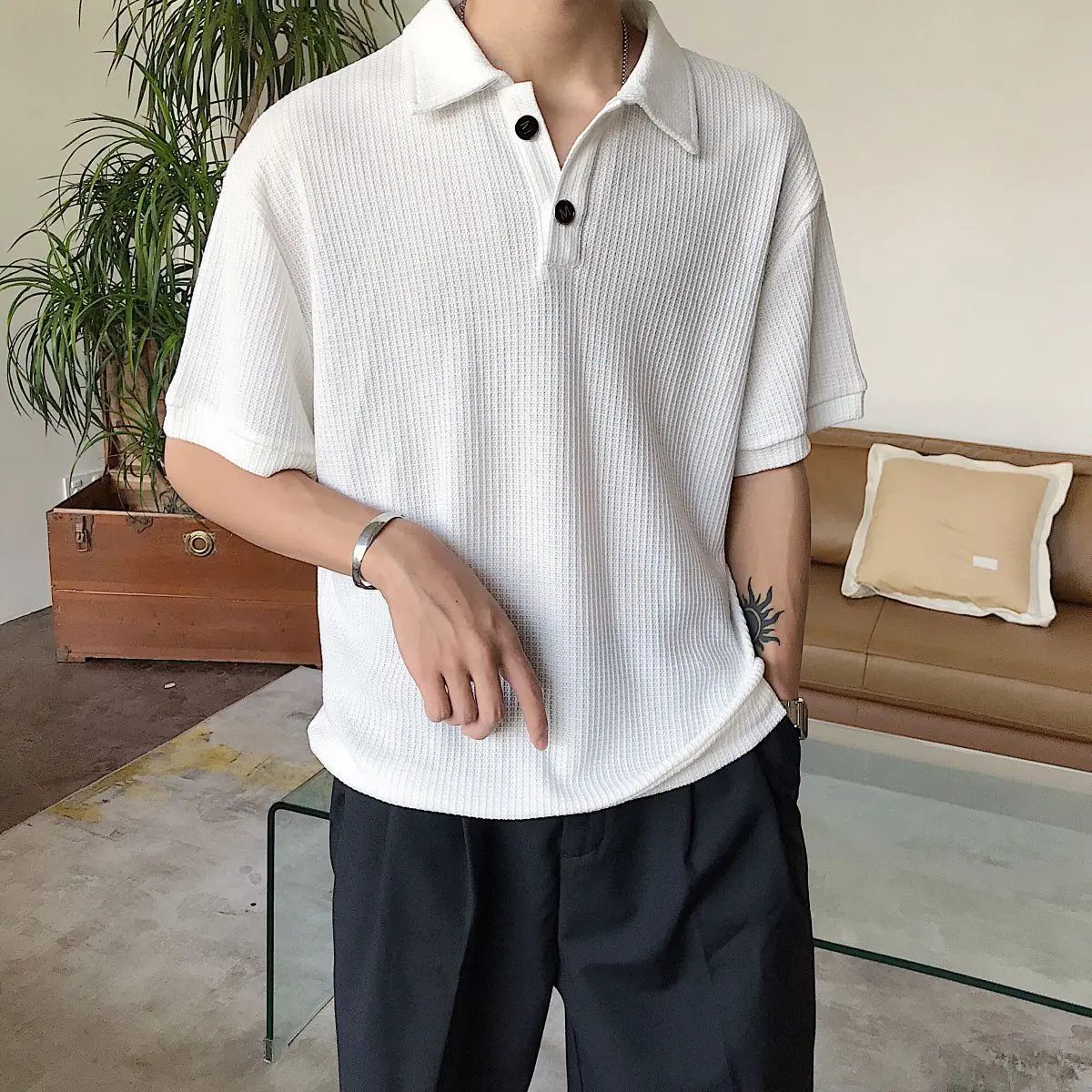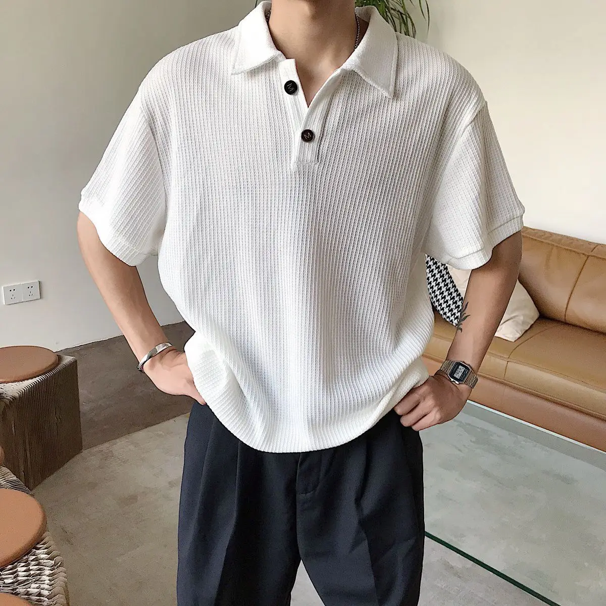 Korean Fashion Simple Short Sleeve Waffle Polo Shirt Men Advanced Texture Good Quality Lapel Loose Casual Solid Color Trend Top