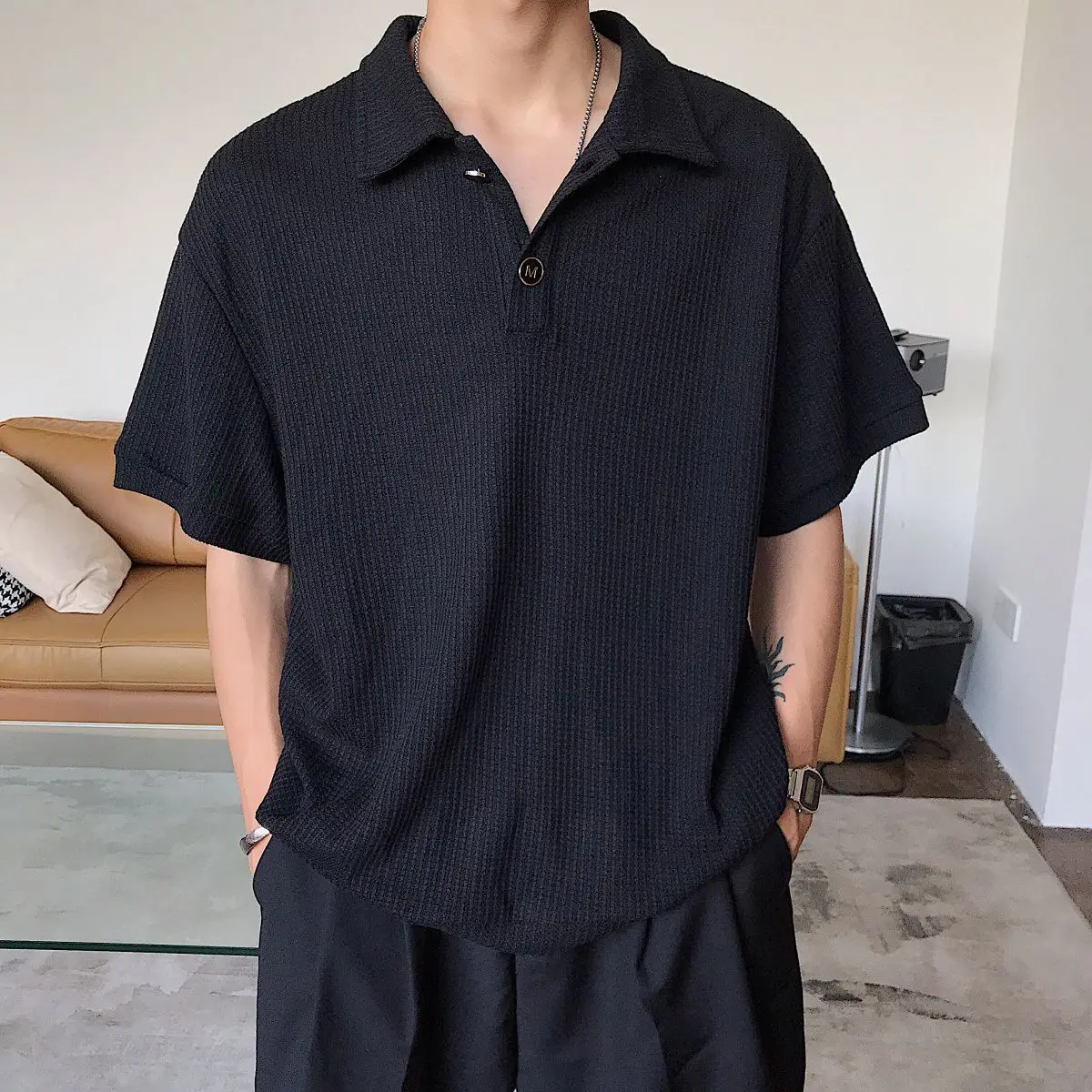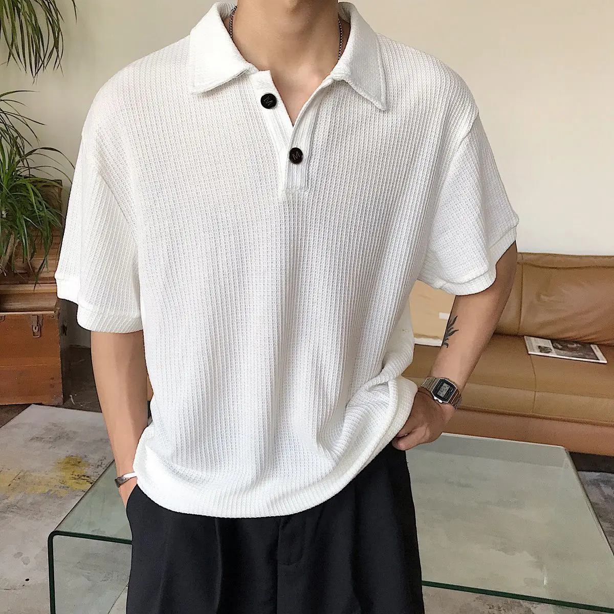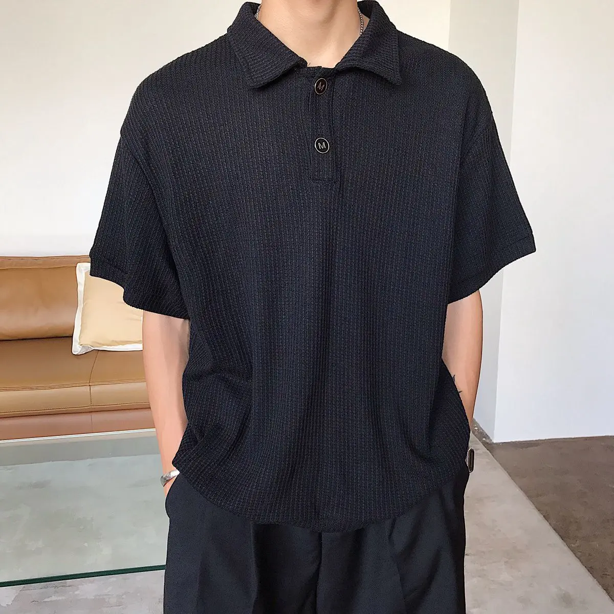 Korean Fashion Simple Short Sleeve Waffle Polo Shirt Men Advanced Texture Good Quality Lapel Loose Casual Solid Color Trend Top
