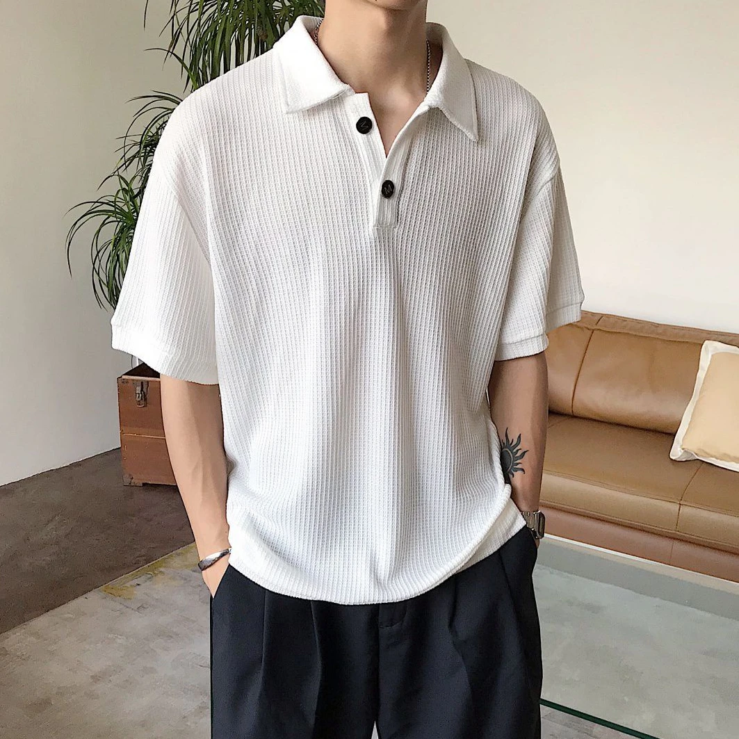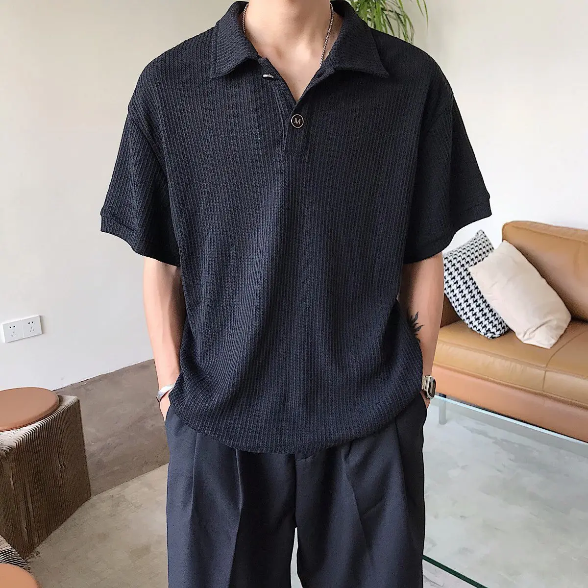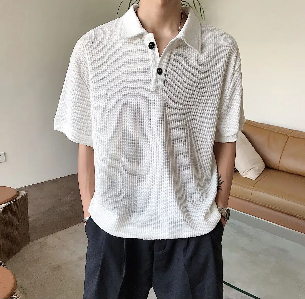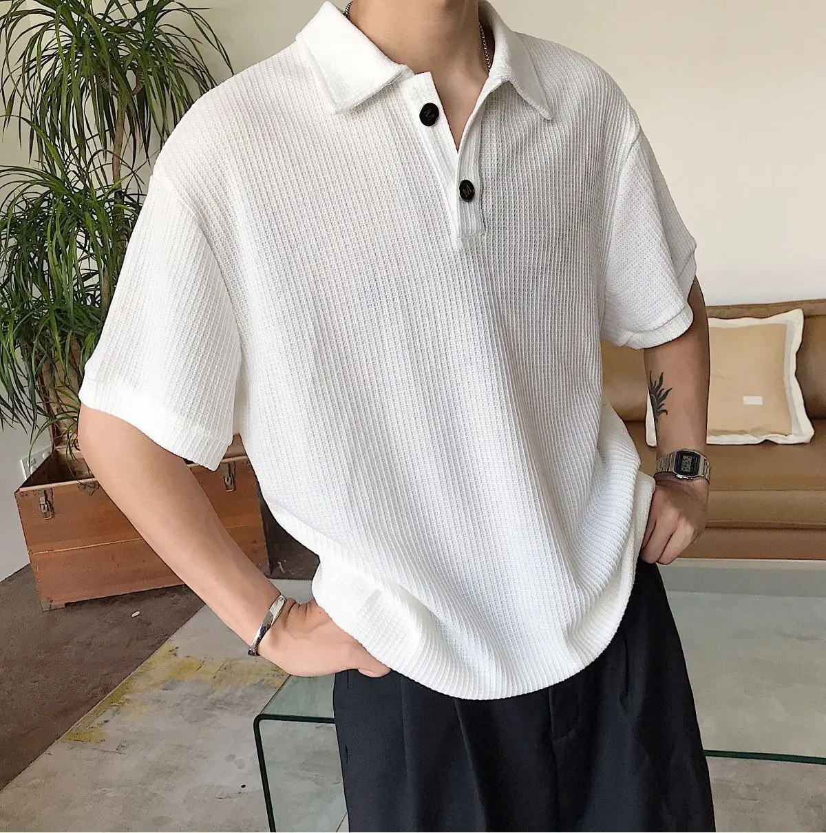 Korean Fashion Simple Short Sleeve Waffle Polo Shirt Men Advanced Texture Good Quality Lapel Loose Casual Solid Color Trend Top