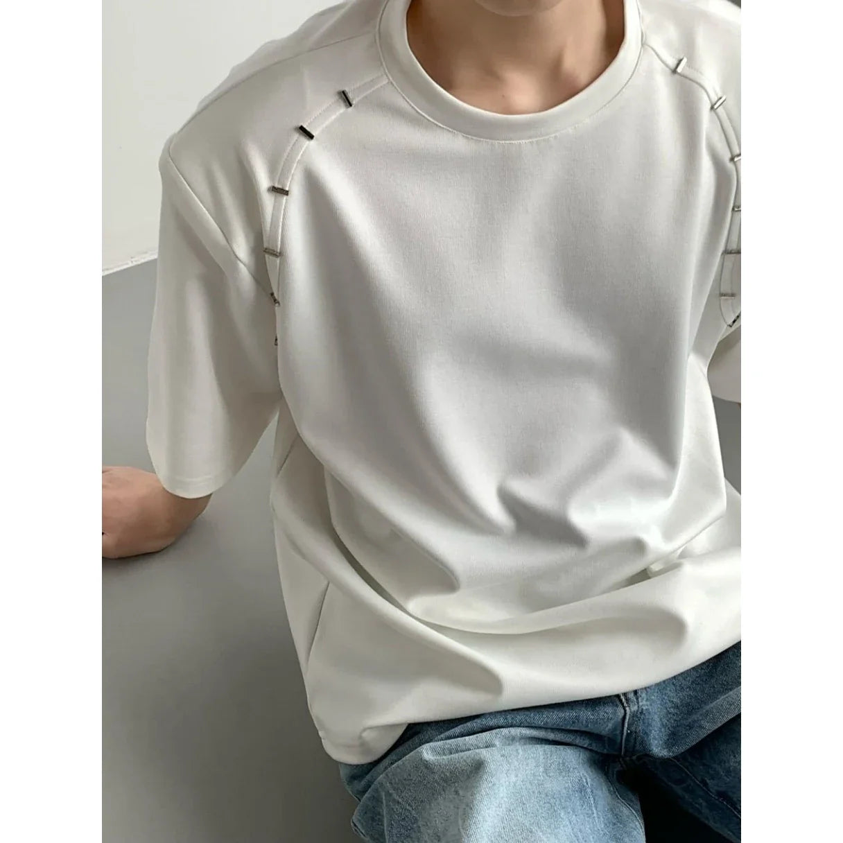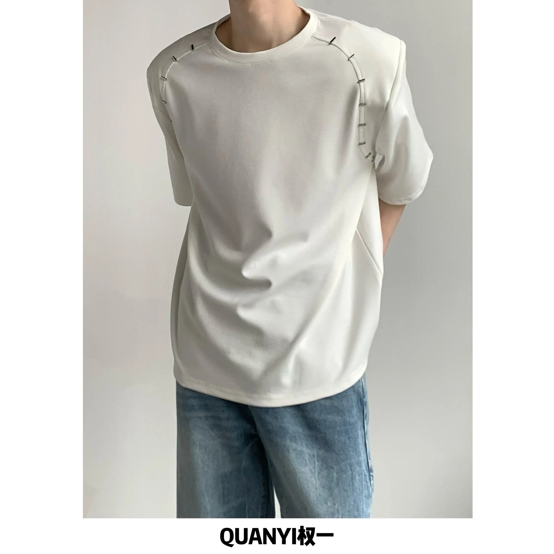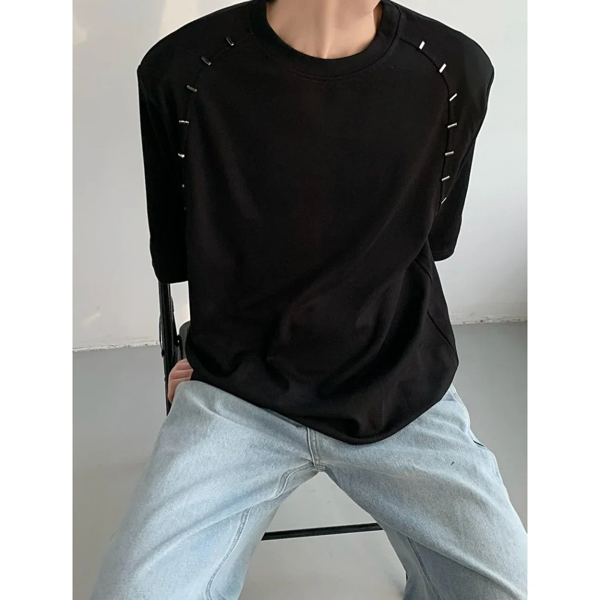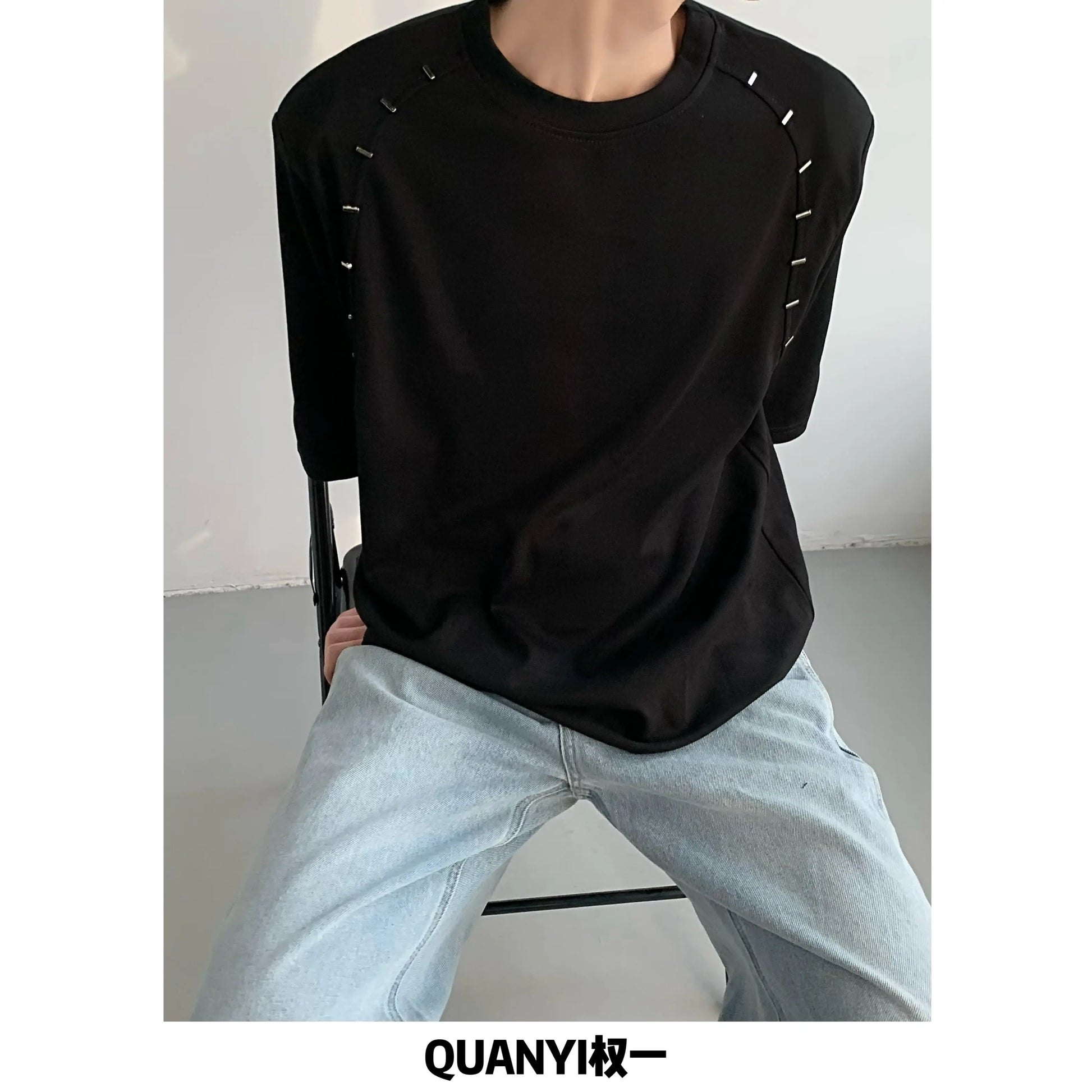 Korean Style Heavy Shoulder Pad Short Sleeve T Shirt Men Metal Niche Design Loose Casual Harajuku Solid Color Bottoming Shirt