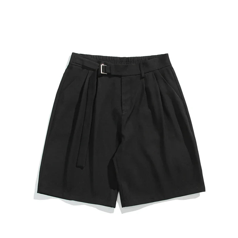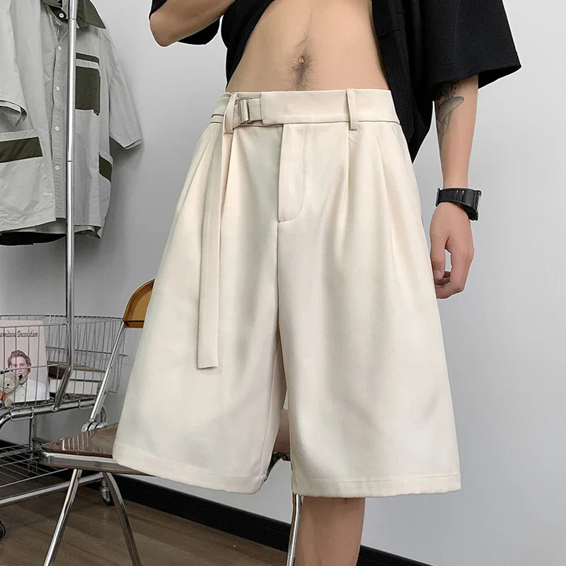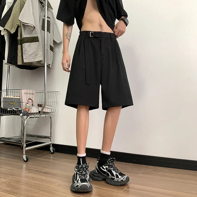 Korean Style Mens Casual Shorts Ribbons Belt Knee-Length Suit Pant Black Beige Elastic Waist Loose Summer Short Trouser Boy